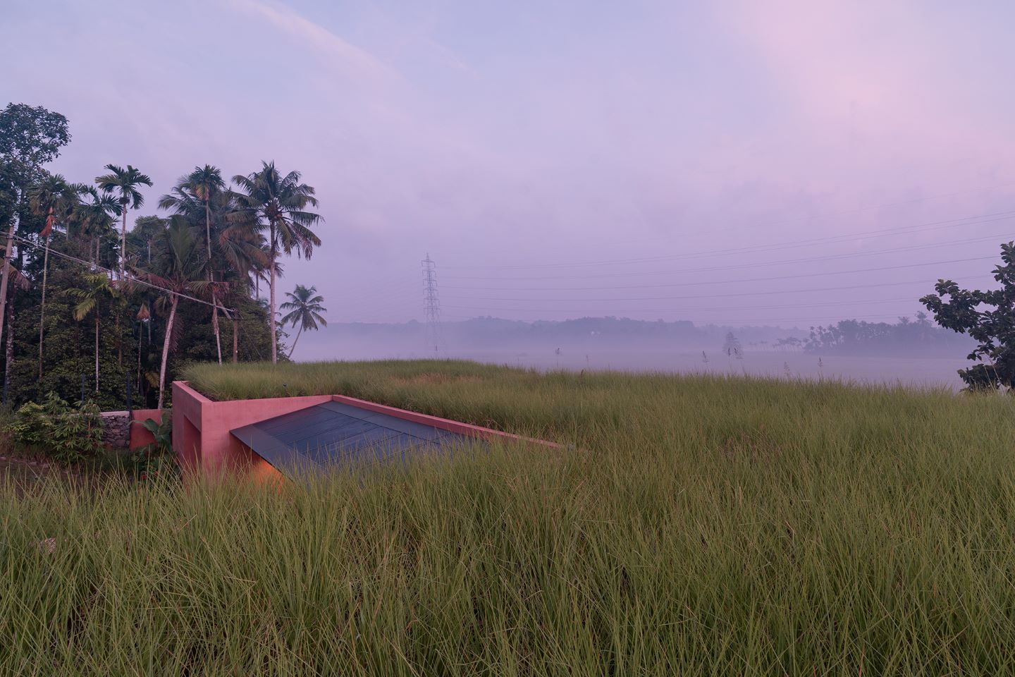 A meandering natural stone stairway takes one down to the house. Unlike a conventional home, there is no main door. One enters below an array of building integrated solar panels (BIPV), into a seamless communal living, dining and kitchen space, and further a column-free sit-out that merges ahead, uninterrupted with the landscape and the paddy. On one side of this common space are two identical bedrooms with attached bathrooms. The bathrooms open up to a private landscape along the boundary of the site. The house is thoughtfully designed considering the airflow throughout the spaces.