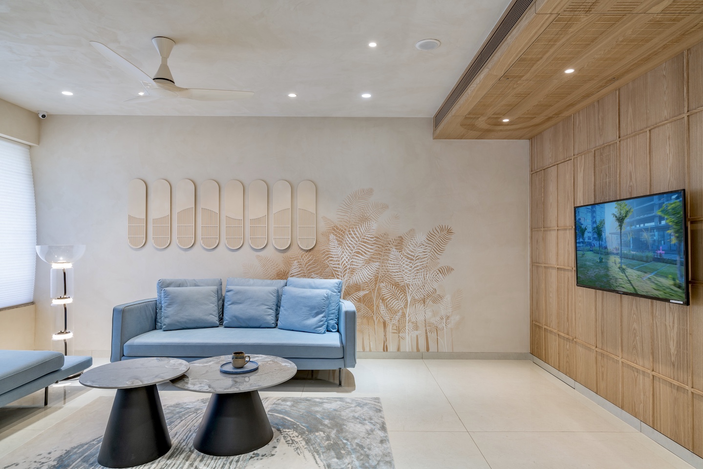 SAMASTA is a sample flat designed with a beautiful synthesis of soft colours, simple geometry and serene tropical art. “The essence of this residence comes from the abundance of soft shapes and colours, curved forms and geometric patterns which are highlighted with textures and materials,” says Arpit Jain, principal designer, JAD Arch Studio. “However, since this was a sample flat, we had to balance the budget vis a vis a design with a universal appeal.”