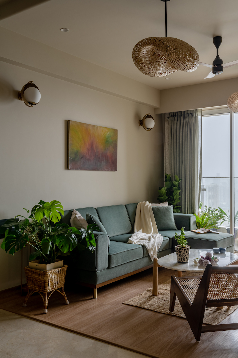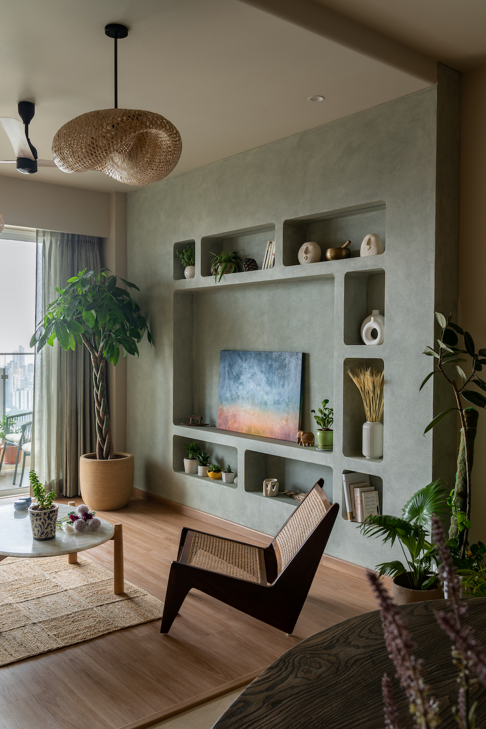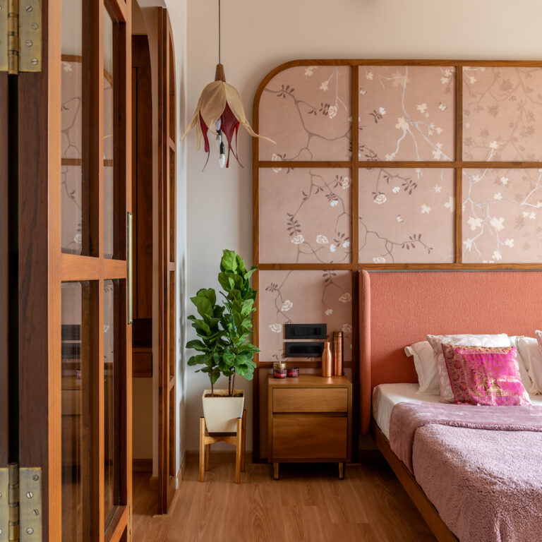 Inside the bustle of Mumbai city lies a 1,000 sq ft haven of calm and elegance. A three-bedroom, hall, and kitchen (3 BHK) apartment, this home follows the contemporary and compelling interior design concept of Japandi. “This philosophy brings together the minimalist sophistication of Japanese aesthetics and the understated functionality of Scandinavian design. It translates into an interior design style that is minimal yet warm, functional yet stylish, and natural yet modern,” say architects Zaheed Lokhandwala of Techton and Hamza Singaporewala of Designology whose design firms collaborated on this project. “Browns and whites dominate, with hints of grey and punctuations of mustard and green, creating a visual rhythm that is as engaging as it is soothing.”