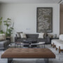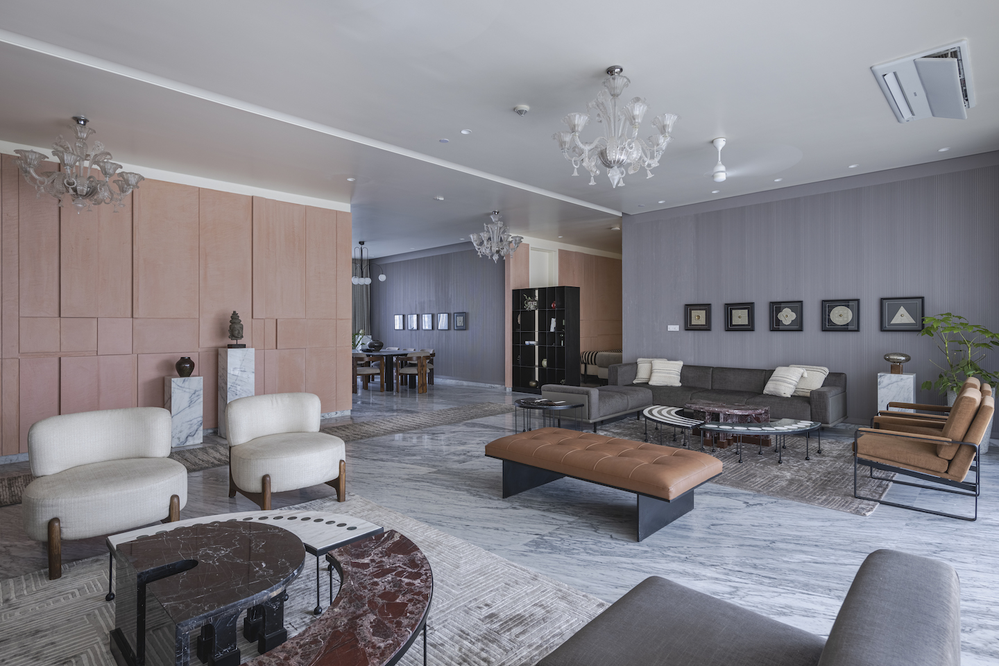 The seating arrangements feature sleek grey sofas harmoniously paired with sculptural chairs on either side, elegantly connected by a supple leather bench. Neutral hues of brown, grey, and white gracefully integrate with the existing flooring and terracotta wall, while the inclusion of black, white, green, and red marble accents adds a captivating contrast and complements the overall palette.