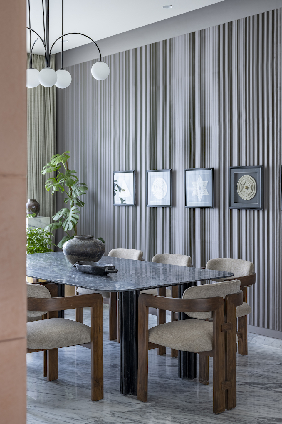 The dining ensemble features a black marble-topped dining table, encircled by elegant Tobias Scarpa chairs. Against the backdrop of the combed textured grey wall, adorned with sculptural artworks, a clean and modern chandelier illuminates the space, enhancing the minimalist aesthetic of the furniture pieces.