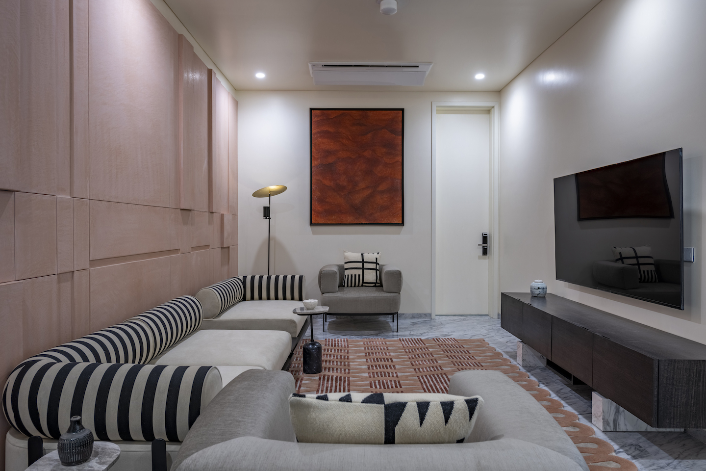 The captivating presence of the terracotta wall continues in the family room, where a geometric patterned rug and a striking red artwork amplify its warm allure. A bespoke sofa, merging with Indian divan influences, provides a relaxing lounging setup. Seamlessly integrated within the sofa, an inbuilt coffee table ensures a clutter-free and serene space.
