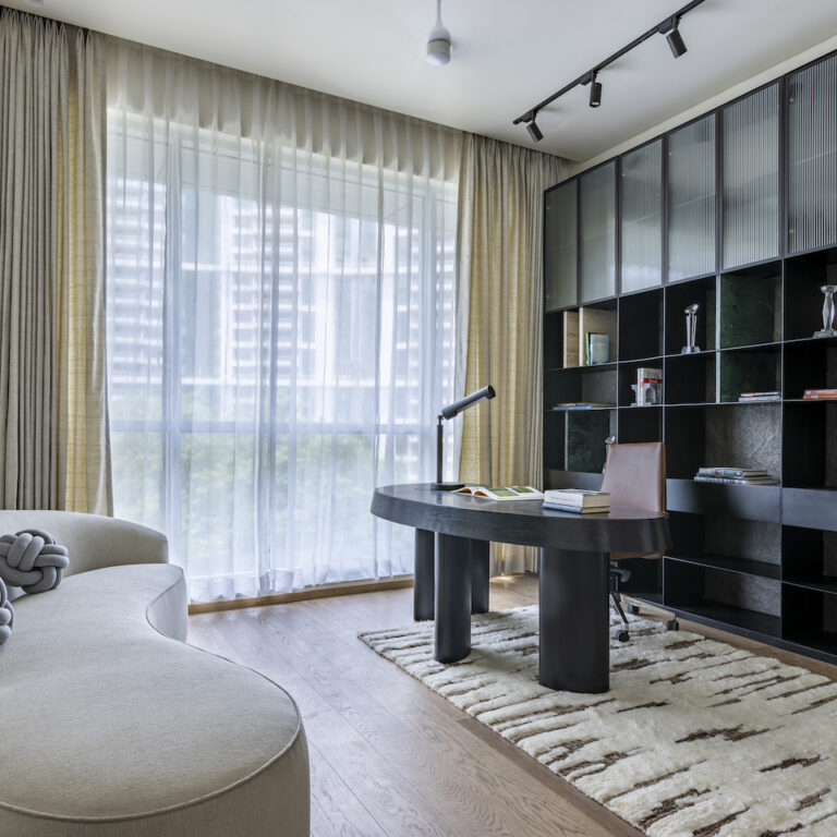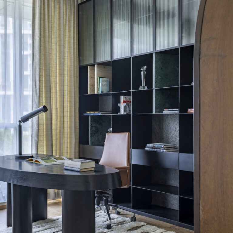 The home office space revolves around three captivating sculptural pieces, each boasting fluid forms: an elegant ivory and black arched cabinet, a sophisticated black desk with custom woodwork, and a graceful serpentine sofa. These organic furniture pieces, with their graceful contours, create a striking juxtaposition against a sleek metal bookshelf characterised by clean grid lines. The bookshelf is embellished with dividers crafted from natural stones, introducing a captivating layer of visual textures. Complementing this interplay of forms and textures is a plush woollen rug, adorned in neutral tones.