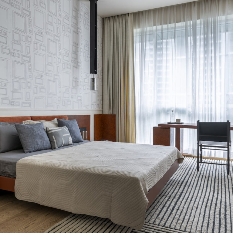 The guest bedroom is inspired by the serene philosophy of wabi-sabi. Natural materials celebrated for their tactile qualities, along with colours, and textured essence, assume the leading roles within this sanctuary. A textured taupe wall serves as a backdrop, accentuating the presence of the upholstered ivory bed framed within the wooden headboard. Side-tables and pedestals, resembling monolithic structures, carved from solid blocks of acacia wood in angular forms.
