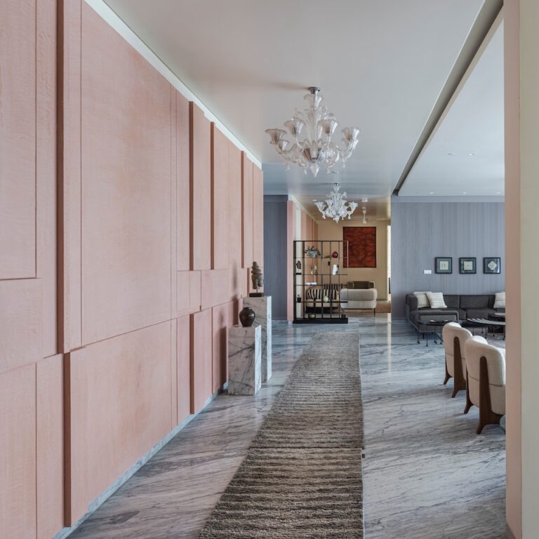 “When the client approached us, they wished to retain all the existing interior finishes, while simultaneously yearning for a space that would truly embody their individuality and personal preferences,” explains Radhika Utpat whose eponymous studio was entrusted with this assignment. The architect’s vision encompassed a warm and bespoke environment meticulously tailored to meet the client’s personal sensibilities and taste in understated luxury.