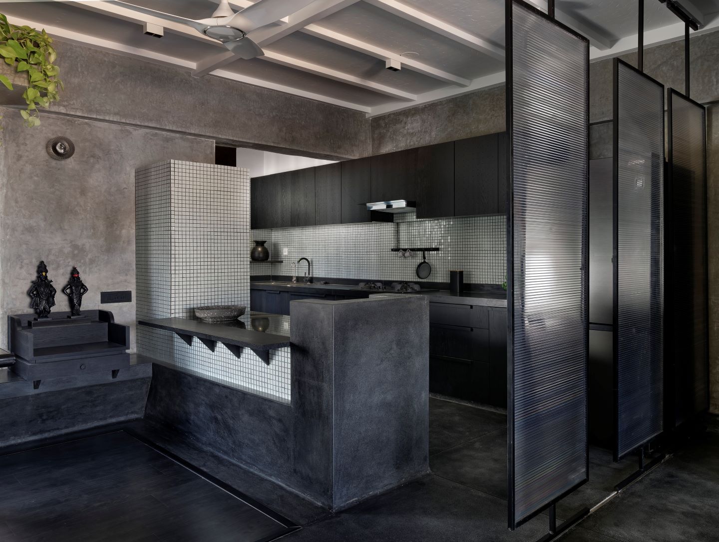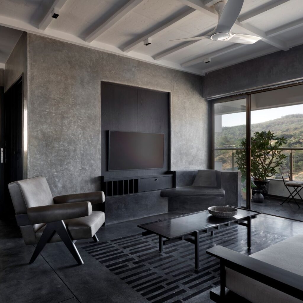 Project Urban Cave captures the raw beauty of a cave — composed of weathered rocks and natural light — in a 1,200-square-foot 3BHK apartment. Home to the founder of Pune-based design firm, Mind Manifestation Design LLP, Anand Deshmukh and his family, the spatial quality of this cavernous space is carved out to create a sober yet joyous atmosphere. The design team’s conscious decision to wrap the entire space in smooth cement plaster (on walls) and dark pigmented in-situ (floor) enhances the charm of the structural skeleton of the apartment. “The vision was to create unfiltered, unhindered and unbiased spaces with a transitive approach towards elemental design,” explains Chetan Lahoti, co-founder of Mind Manifestation Design LLP.