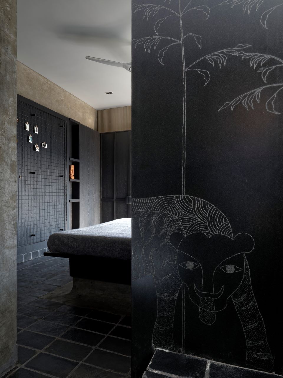 Local basalt and marble are used in the house for varied details: small chips in cement floor, tile form for flooring, and large slabs for partitions and countertops. Artwork on stone by hand tooling artists at strategic locations helps to set the context right. The change in character of bedrooms is not visible prominently but can be experienced through subtle variation in flooring typology.