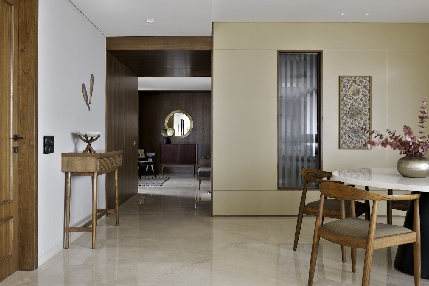 Mahogany Apartment is located in an upcoming western part of Ahmedabad, tucked in a quiet by-lane. The apartment was a bare shell apart from the peculiar Italian flooring given by the developer. The challenge was to create something in sync with such a strong base.