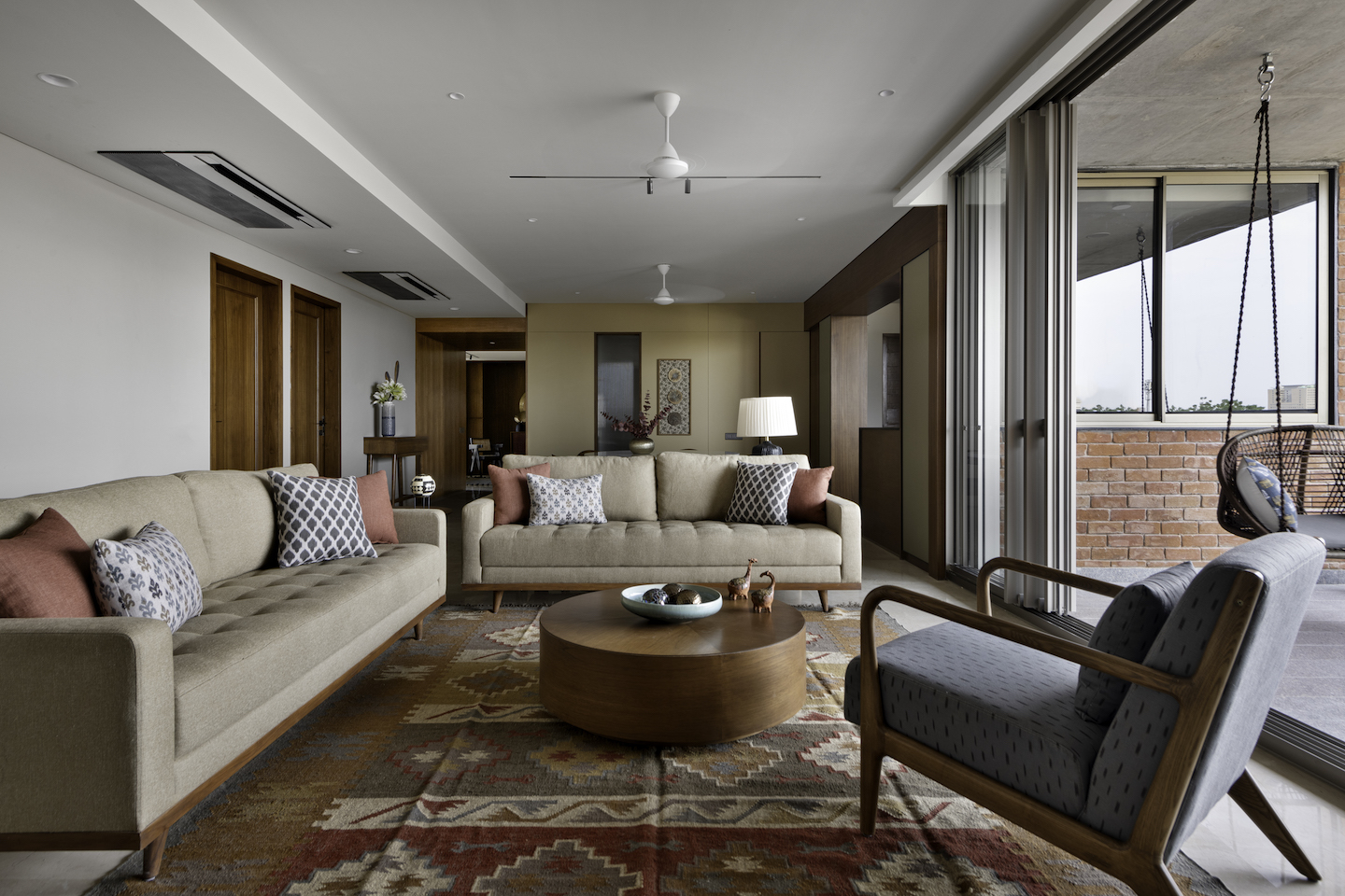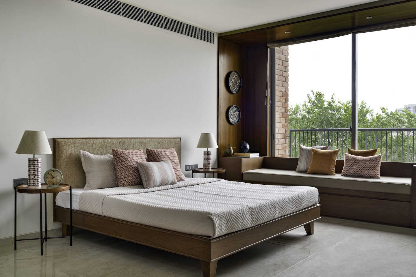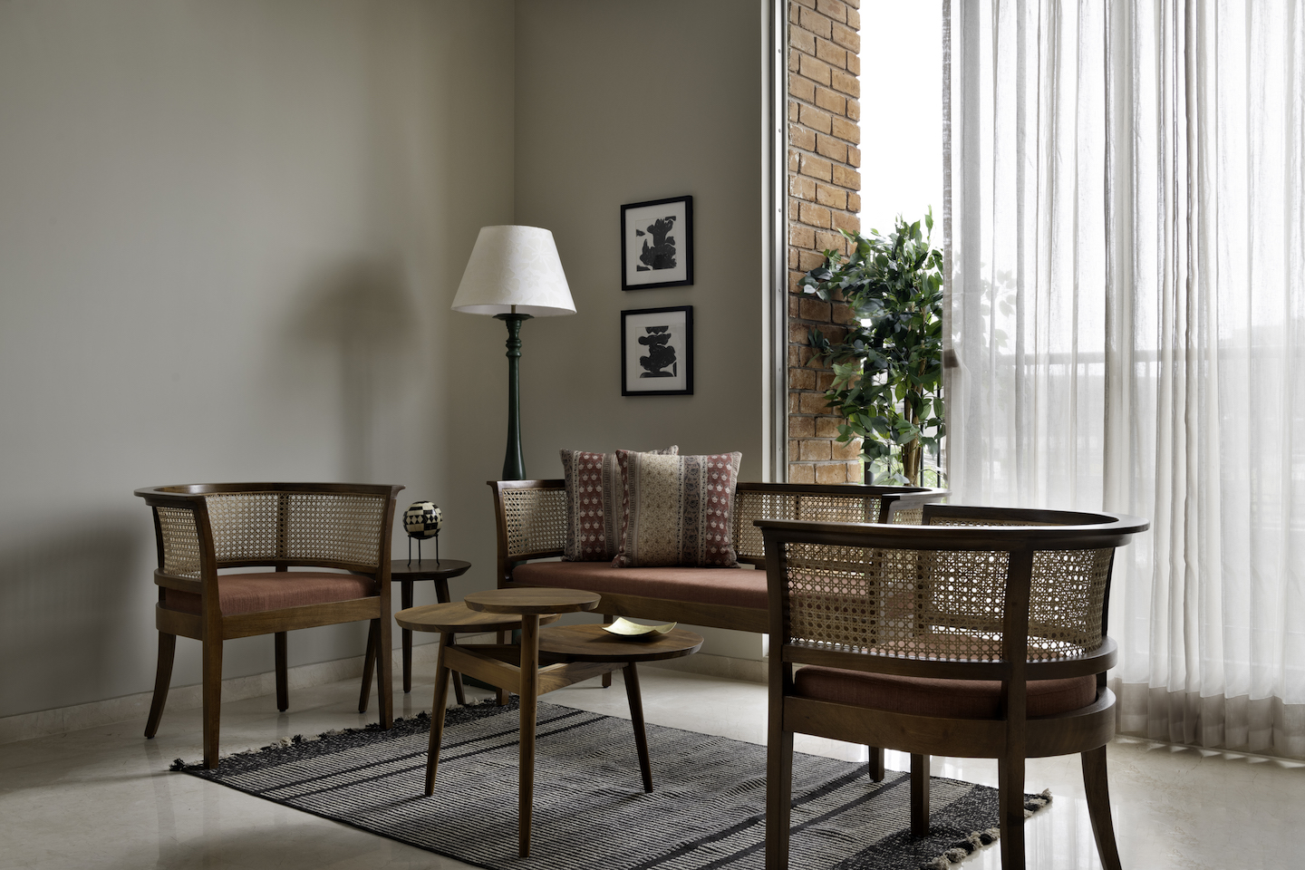 The balcony had an exposed brick wall which set the tone for overall colour tones and textures used in the house. Warm hues of rust and mustard in fabrics, rugs and decor give a homely feel to the living room. Whereas, the bedrooms are simple yet contemporary in nature with soft shades of beige and brown. Overall the apartment has a natural material palette consisting of exposed brick, teak wood with natural polish. The fabrics are all cotton with block prints and earthy tones.
