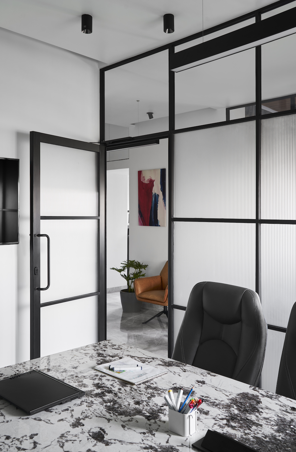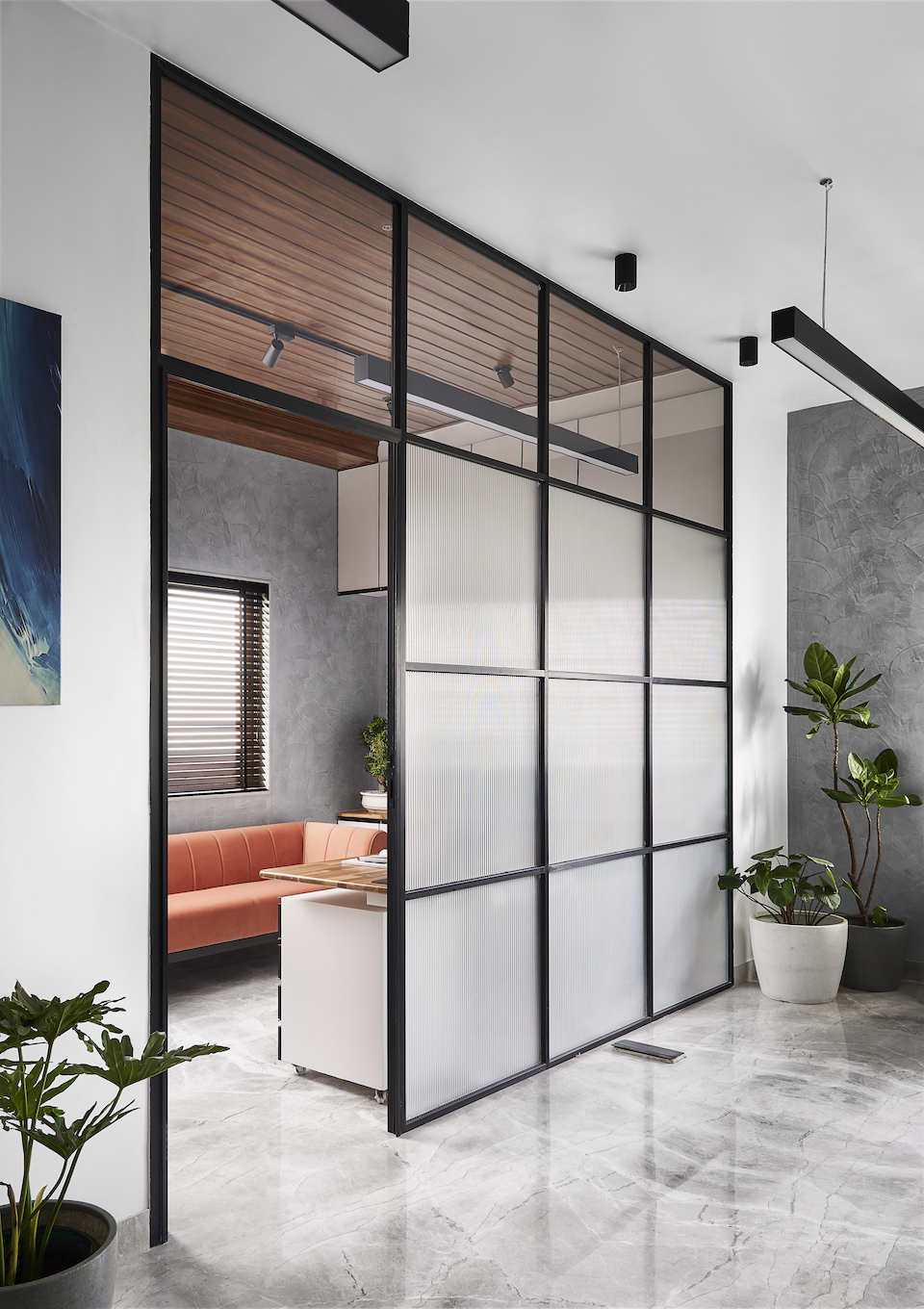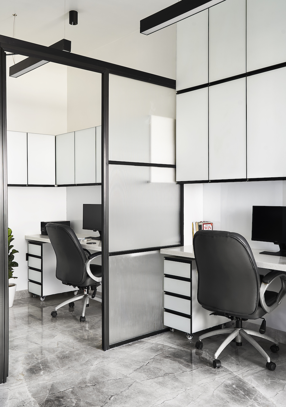 To come to the specifics of materiality, the floor is clad in a light white-grey marble, while the walls are covered in whites and a grey textured stucco paint. For the storage units, the team opted for matte white shutters with matte black concealed handles. The partitions are built in a matte black aluminium frame with fluted and clear glass in between. The reception area has a dark teal blue two-seater sofa with the reception table wrapped in a dark grey bottom with a black and white patterned marble on top. The desk has a backdrop of frosted-glass bricks. Master cabin 01 has a wooden-finish PVC panelled ceiling and a brass-bordered bluish-grey marble piece as wall art on the textured wall. The table tops of this cabin are topped in a horizontal wooden hedge-bone pattern in a matte PU finish. For master cabin 02, the team went in for a completely white theme starring white terrazzo stone in different finishes. In the conference room, the tabletop is wrapped in the same black and white patterned marble stuck to the window wall with a fat round bottom leg in dark grey. “We really love how textures, colours and patterns can change any space,” smiles Jeet.