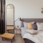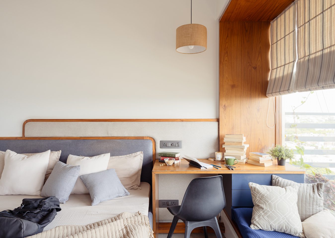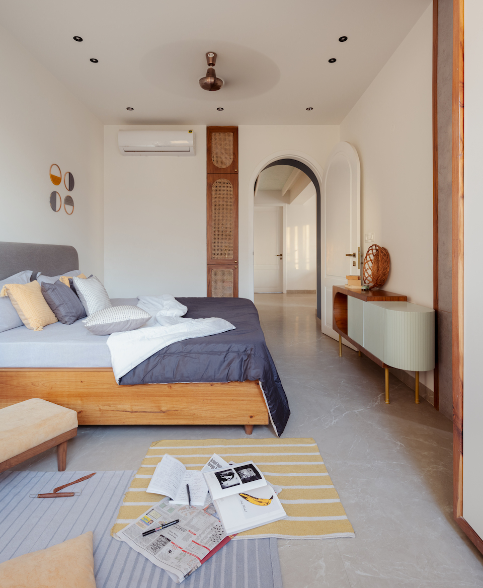 An extended volume with a window in the elder son’s bedroom acts as a bay window, serving as an extension of the study for a variety of activities such as reading, working, and lounging. The conjunction of pastel blues and pinks with woven cane adds picturesque charm to the master bedroom.