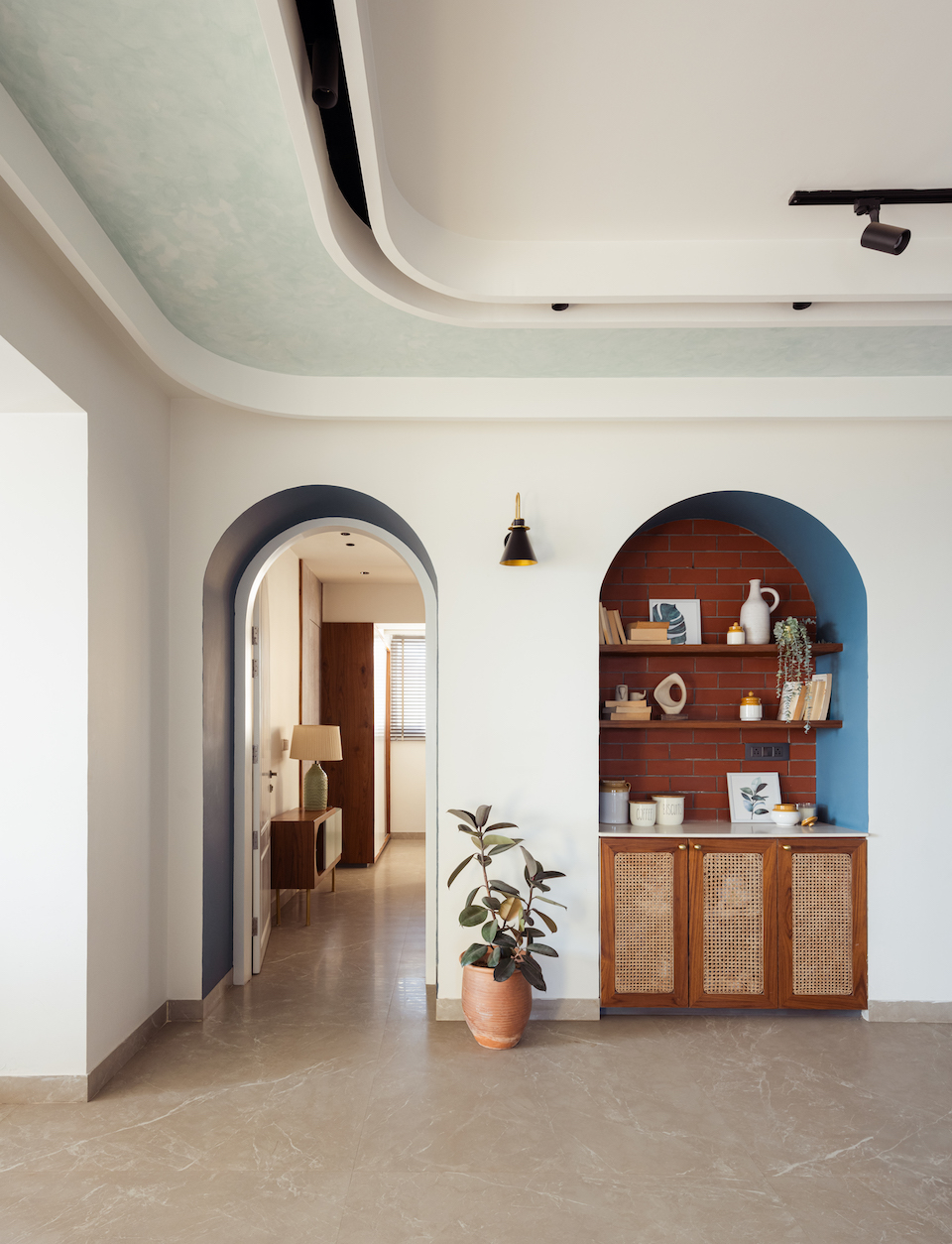 The teal cabinets in the kitchen create a distinctive contrast and infuse energy into the overall ambience. “This vibrant addition acts as a lively focal point against the neutral living area, creating a captivating visual journey through contrasting tones and styles,” elucidates the duo. A white textured wall mural in the living room, featuring definite geometries, creates relief patterns while reinforcing the minimalistic approach. Exposed brick contrasts beautifully with a bold teal hue in the niche, adding to the textural symphony in the home.