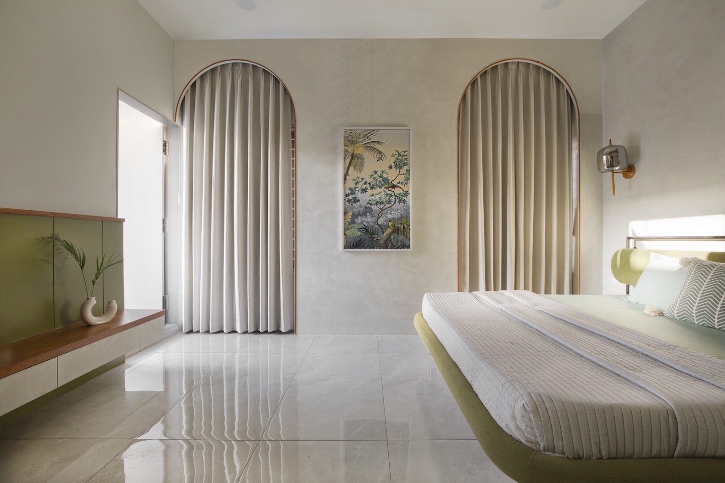 The master bedroom design evokes a natural tropical environment, and antidote to the surrounding concrete jungle. Olive is the dominant colour. The wall is painted with stucco and a wooden log is used behind the bed with the shades of green and rhythmic waves carved on its surface, symbolising the dynamic journey of life through thick and thin. Lighting plays a pivotal role here acting as a brushstroke that highlights key features and creates a nuanced atmosphere. Every corner and edge gracefully curves, creating an atmosphere of fluidity and softness.