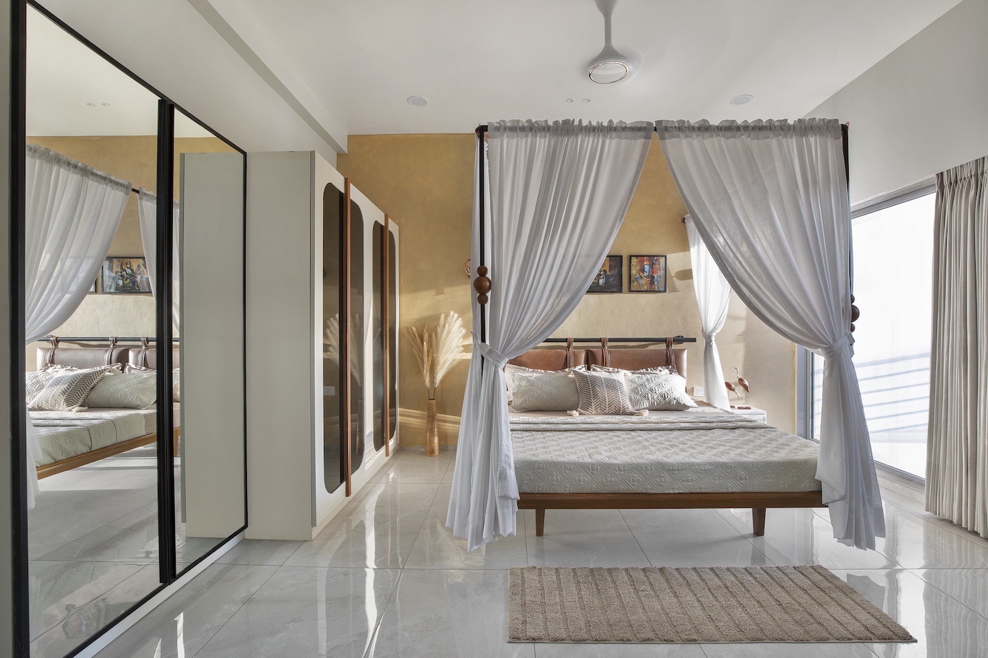 The first guest room seamlessly captures the rich tapestry of Indian heritage while providing a serene and welcoming ambience. The room offers a panoramic view of the lake. At the heart of the room stands an exquisite four-poster Maharaja bed with leather bed-back and posts reminiscent of abacus rods. One of the walls is bathed in a warm mustard hue, drawing inspiration from the vibrant colours seen in traditional Indian textiles and palatial interiors. A large black mirror reflects the beauty of the room, creating an illusion of spaciousness and openness.