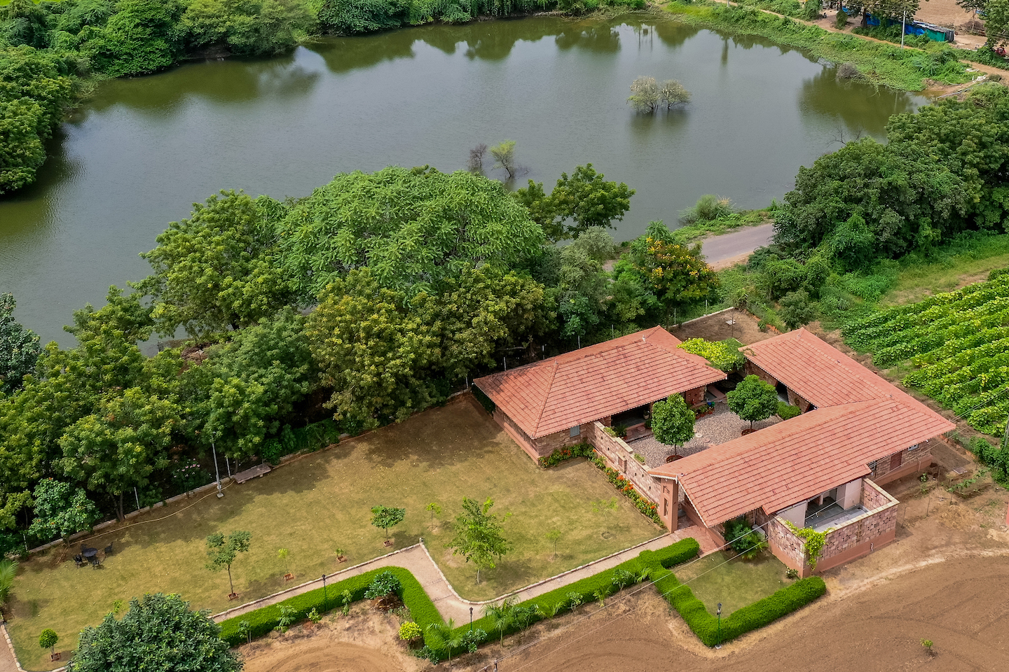 As an integral part of the rural fabric, Tribhuvana is Himanshu Patel and his practice d6thD design studio’s workspace located in a village called Khanderaopura near Ahmedabad, Gujarat. Nestled within a farm, the building group exists alongside the ongoing farming activities that flourish across the surrounding expanse. Situated in proximity to an expansive lake and a road, this unique environmental tapestry serves as a catalyst for the building orientation.