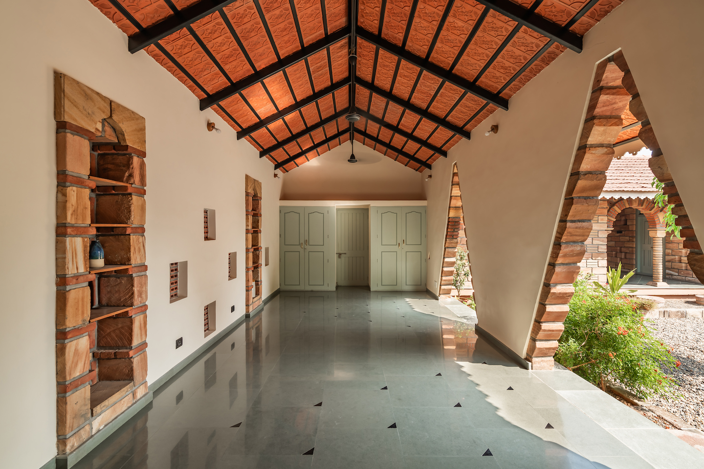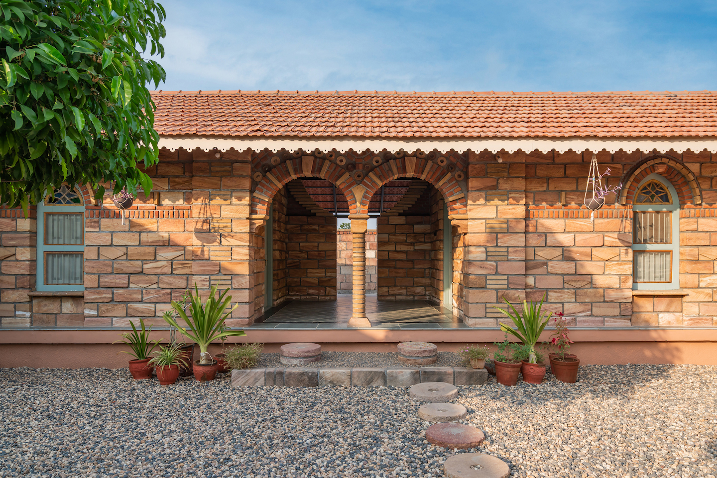As the name Tribhuvana suggests, there are essentially three building blocks. The architectural configuration takes shape as a dynamic L-shaped plan formed by three interconnected building blocks, each with its distinct purpose. With a climate-conscious design approach, the studio and residence blocks align north-south to combat heat gain. The multipurpose hall adapts easily, transitioning from presentations to communal discussions and events. Despite diverse functions and varied walls, a unified character emerges through a consistent material palette, featuring local stone, bricks, and terracotta tiles. Coloured glass in windows adds vibrancy, striking a balance between aesthetics and cohesion.