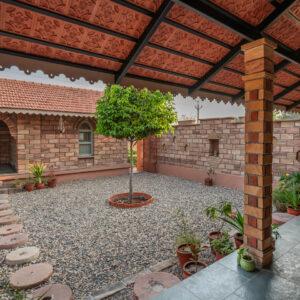 On the east side of the courtyard’s wall, a temple niche stands as a celestial narrative woven into the architecture. A Ganpati placed in a jharokha like niche window engages in a silent dialogue with tradition and nature. As the sun’s earliest rays grace this element, it becomes a beacon of spiritual illumination, casting its radiance upon the heart of the dwelling.