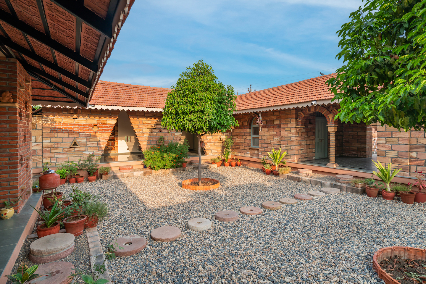 Objects in the courtyard have been thoughtfully sourced over years, from nearby villages, travels, and even home. For instance, the steps are made from stone chakki or grinder, once used in the domestic lives of villages. This selection honours the heritage and ingenuity, preventing their neglect or discard. This curation serves a dual purpose, being cost-effective and infusing a tactile essence into the surroundings. Each item holds a historical narrative, now brought to life, fostering connections and inviting stories.