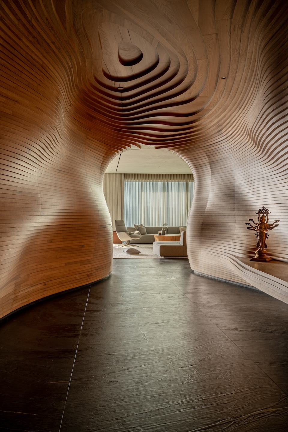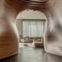 The heart of the project, the cave-like entry foyer is the highlight of this project. “The cave-like structure was challenging to execute. The design was visualized, but to realize it was a tough and expensive task. D3Lab, a parametric expert, made it easier with their software and generating the right ecosystem for execution. The skill and wisdom of the carpenter was extremely valuable to execute this cave with such precision,” says Dinesh.