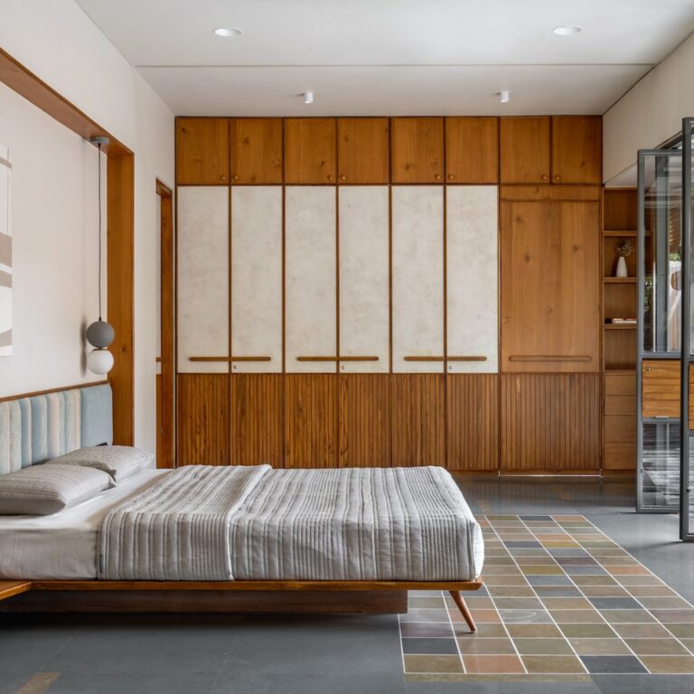 The journey through the house continues up a staircase made of mild steel plates and recycled wood treads, leading to the first floor where the bedrooms overlook the double-volume space, maintaining a visual connection throughout the home. The parents’ bedroom, with its mix of contemporary and traditional elements, opens into this central volume, ensuring cross-ventilation and a flood of natural light.