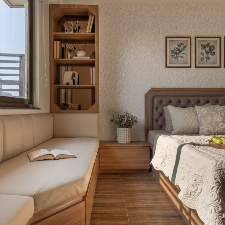 Upstairs, in the daughter’s room, safety meets style, with a cleverly designed safety grill framing the seating area. The custom French bed, polished in sophisticated black, sets an elegant tone, while PU-finished wardrobes and a seamlessly aligned restroom door add modern flair.