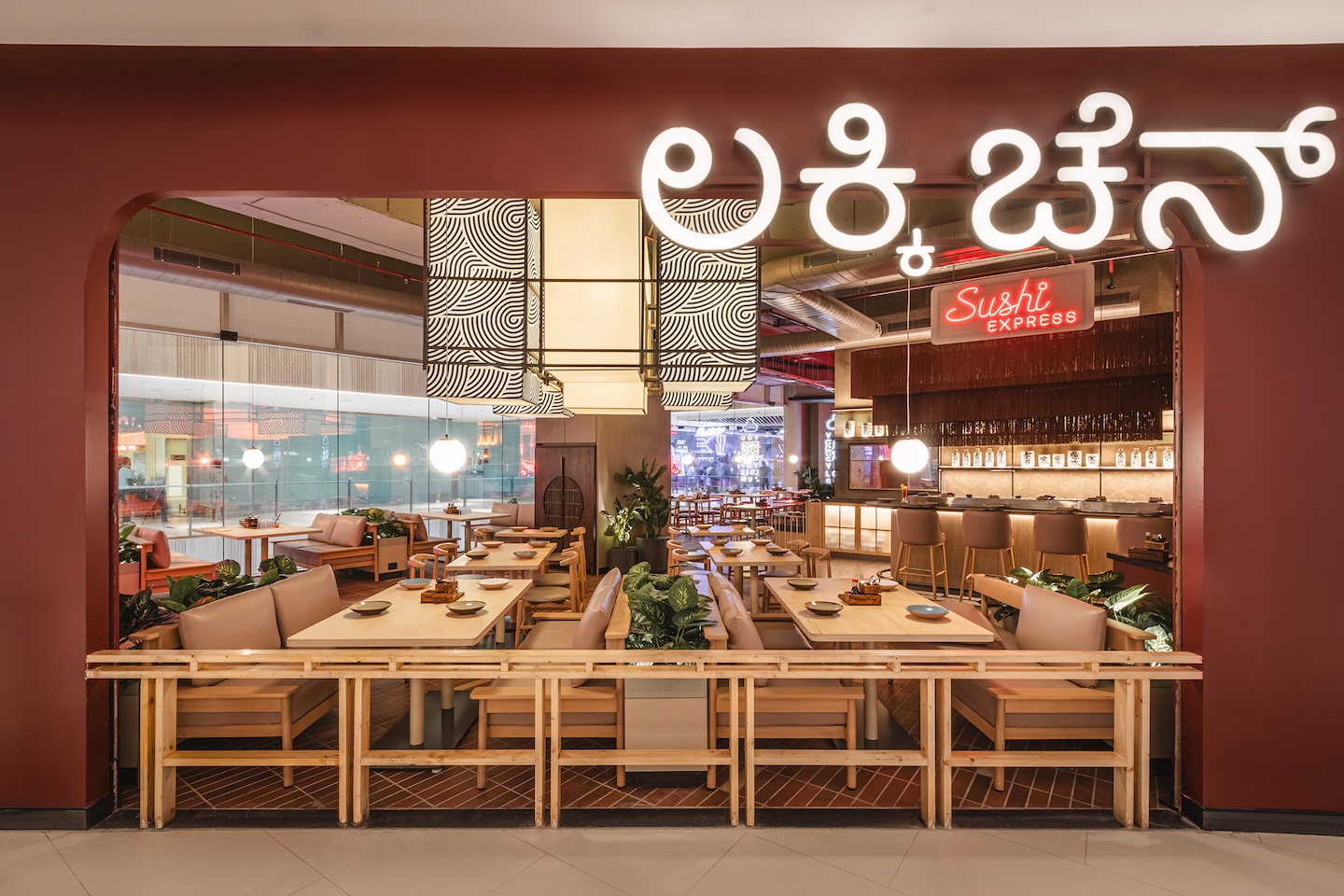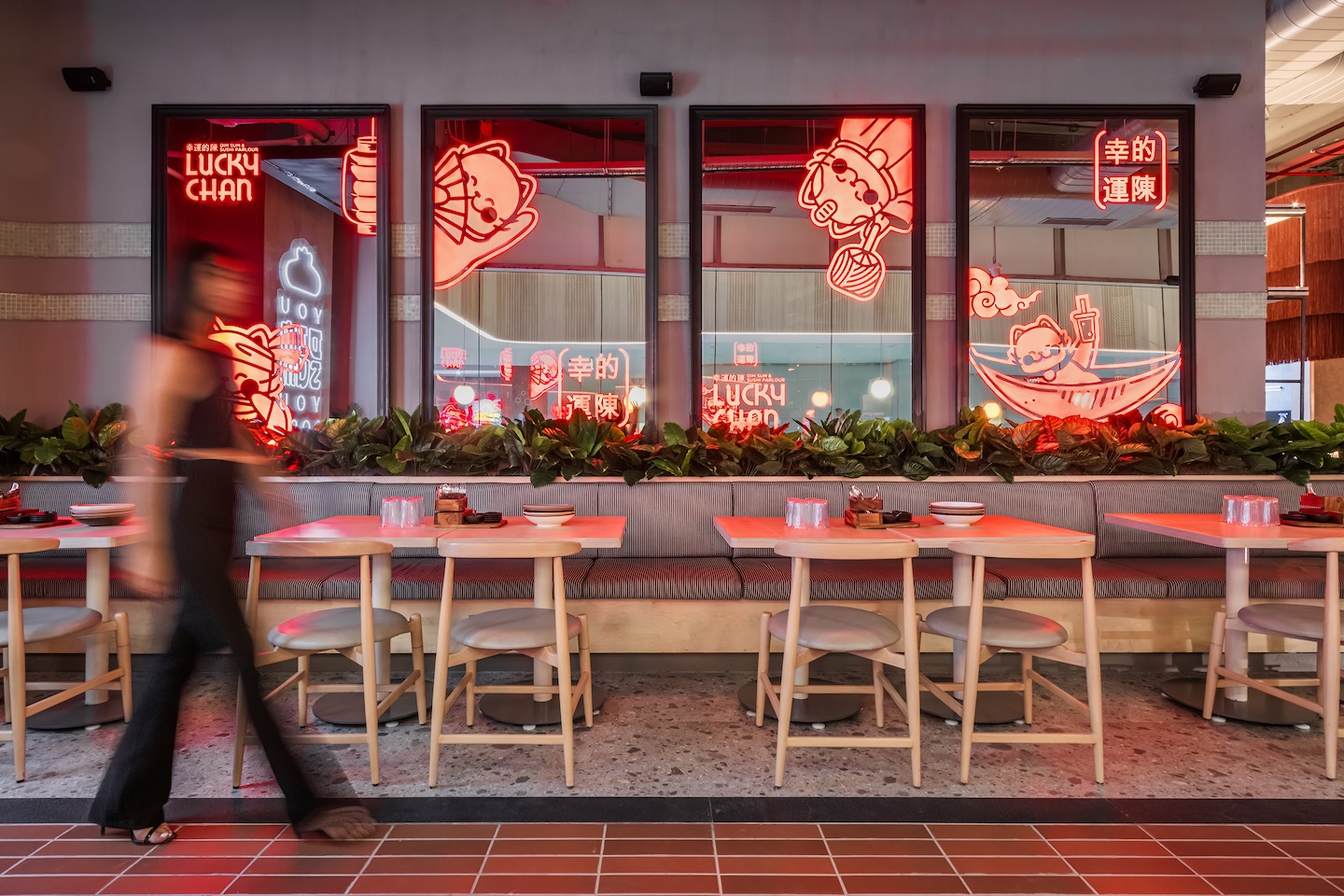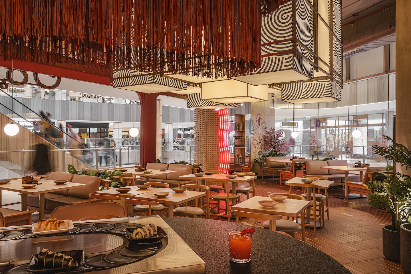 “The design intent was to create a casual dining experience reminiscent of dining experiences in Japan, or say Bangkok,” reveals the architect. “Neon lights, bold patterns, an almost industrial shell that hosts large sculptural light fixtures, all helped create a vibe for this outlet that was quirky and whimsical.”