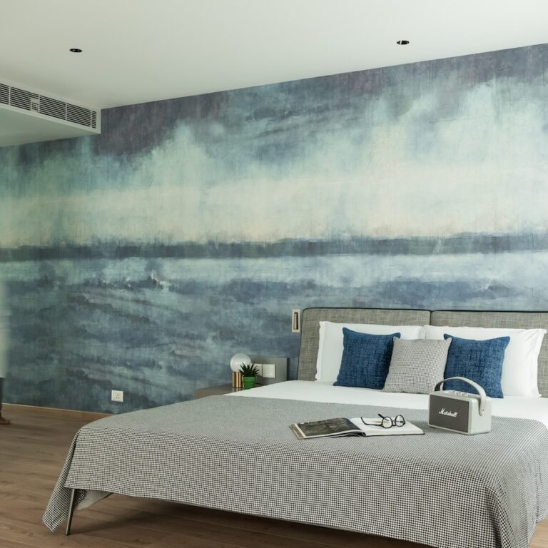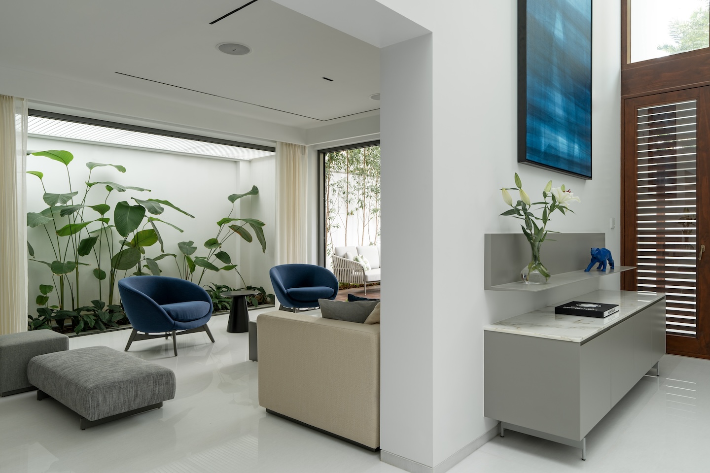 Continuing from this foyer, the path leads to a double-height lobby which is illuminated by a skylight. The inclusion of a glass window on the entrance wall establishes visual connectivity with the tree outside. This allows the morning light to cast enchanting patterned shadows from the tree, creating a captivating play of light on the blue canvas adorning the wall of the foyer, extending to the floor.