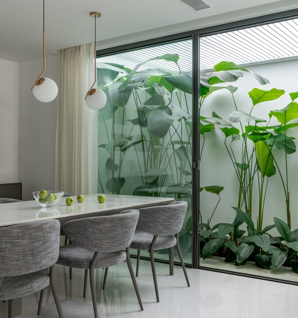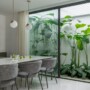 Illustrating a narrative of harmonizing light, texture, and foliage, each floor’s design is thoughtfully planned to consider climatic factors, enhancing the comfort of the inhabitants. The ground floor strategically situates public spaces such as the living room, kitchen, and dining area on the northern side, complemented by an enchanting light well adorned with Calathea lutea plants, creating a revitalizing and comfortable atmosphere.
