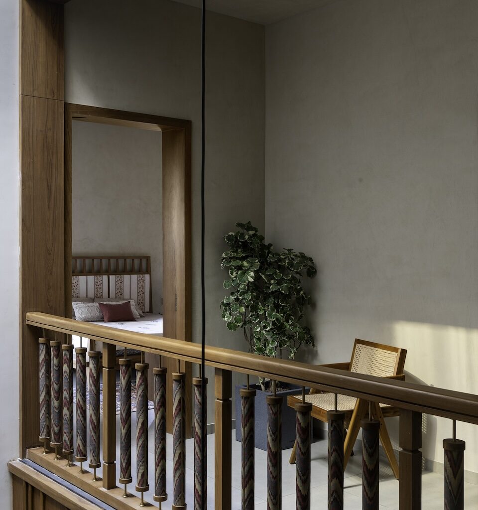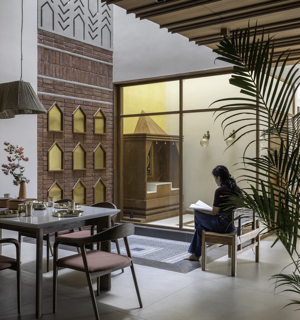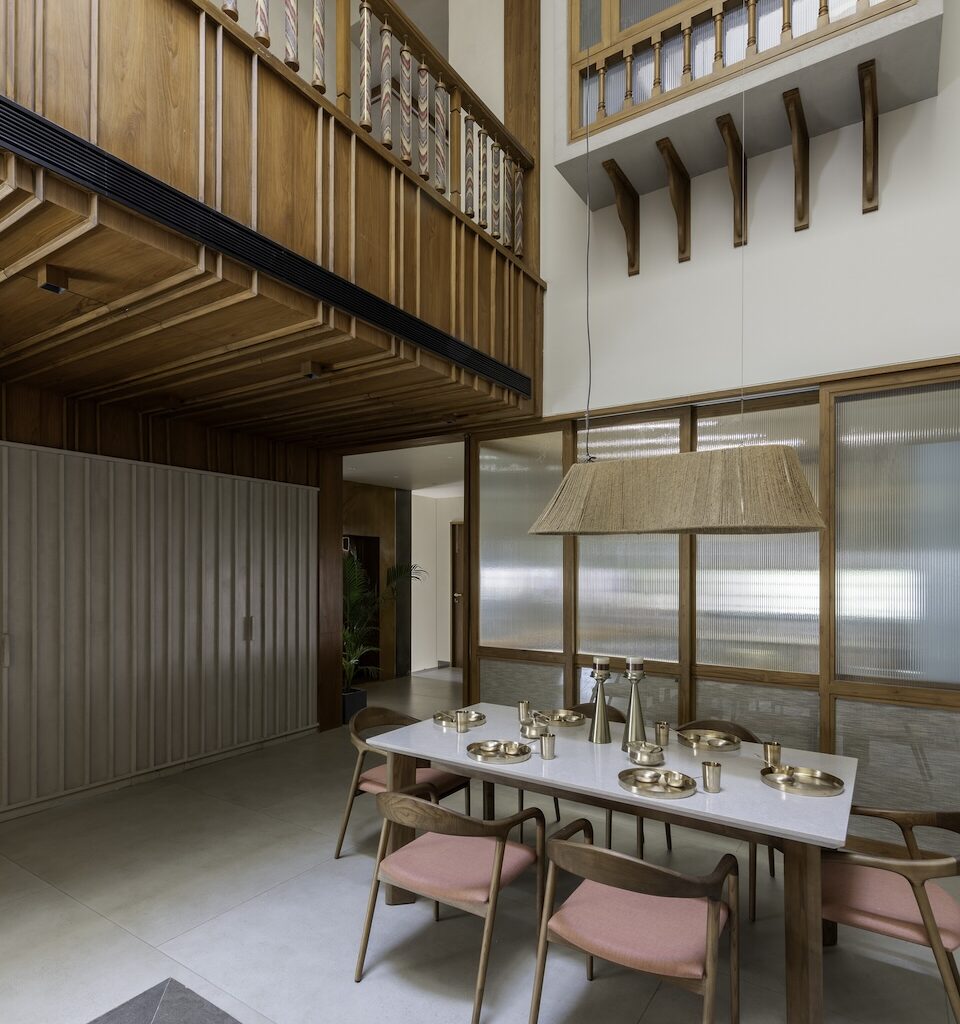 The courtyard and double-height dining space bring daylight and a sense of drama, while Ikat-inspired engravings in concrete walls, fabric-wrapped railings, and brass detailing enrich the interiors.