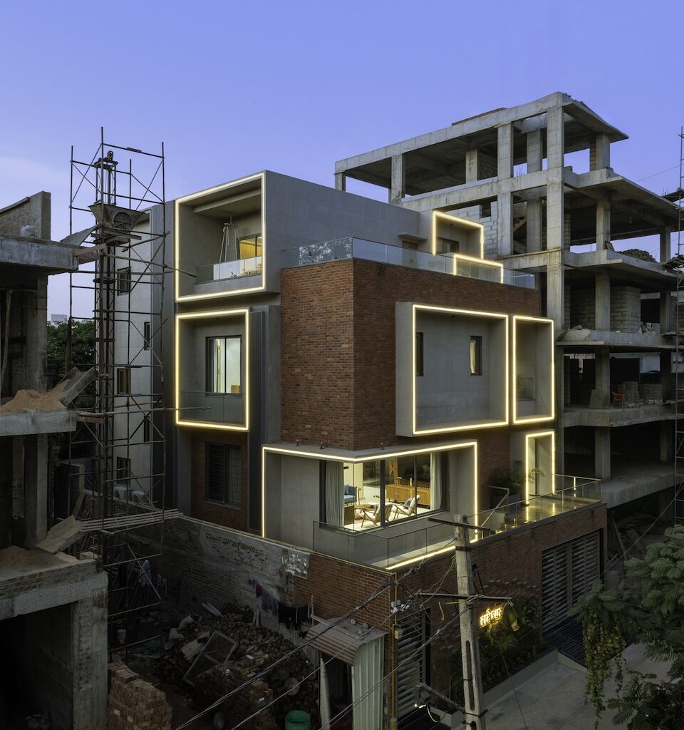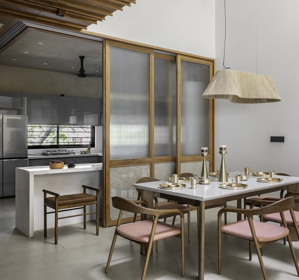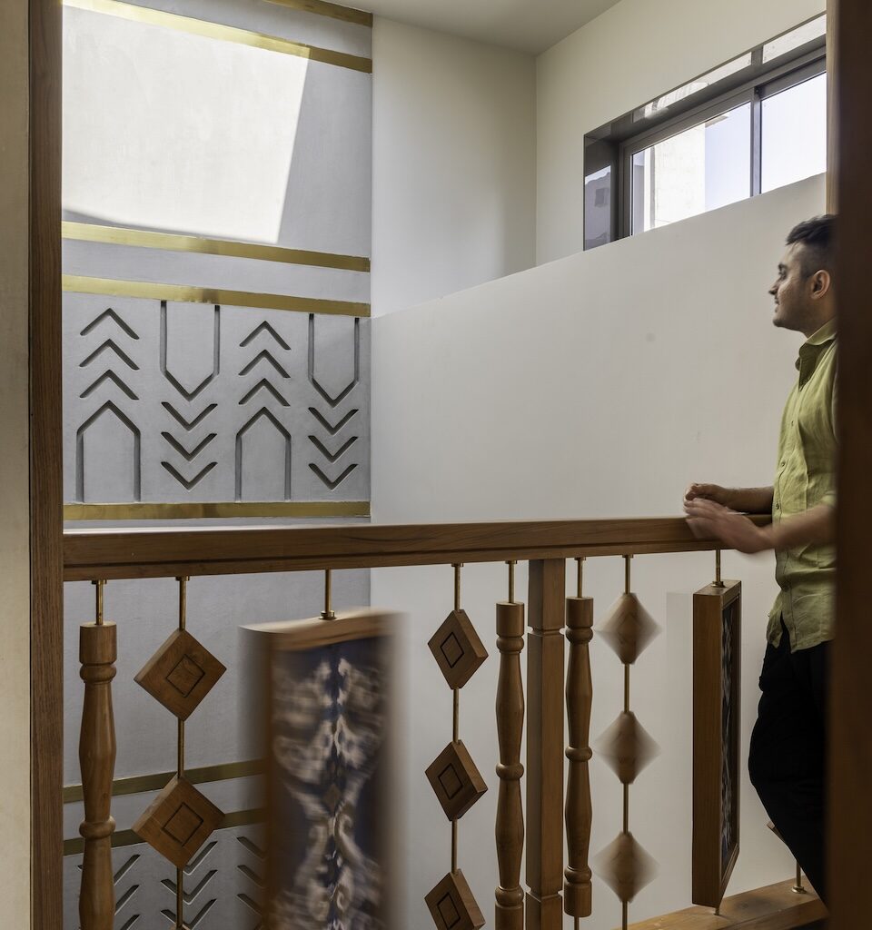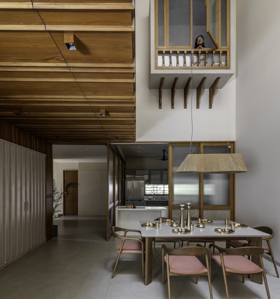 The courtyard and double-height dining space bring daylight and a sense of drama, while Ikat-inspired engravings in concrete walls, fabric-wrapped railings, and brass detailing enrich the interiors.