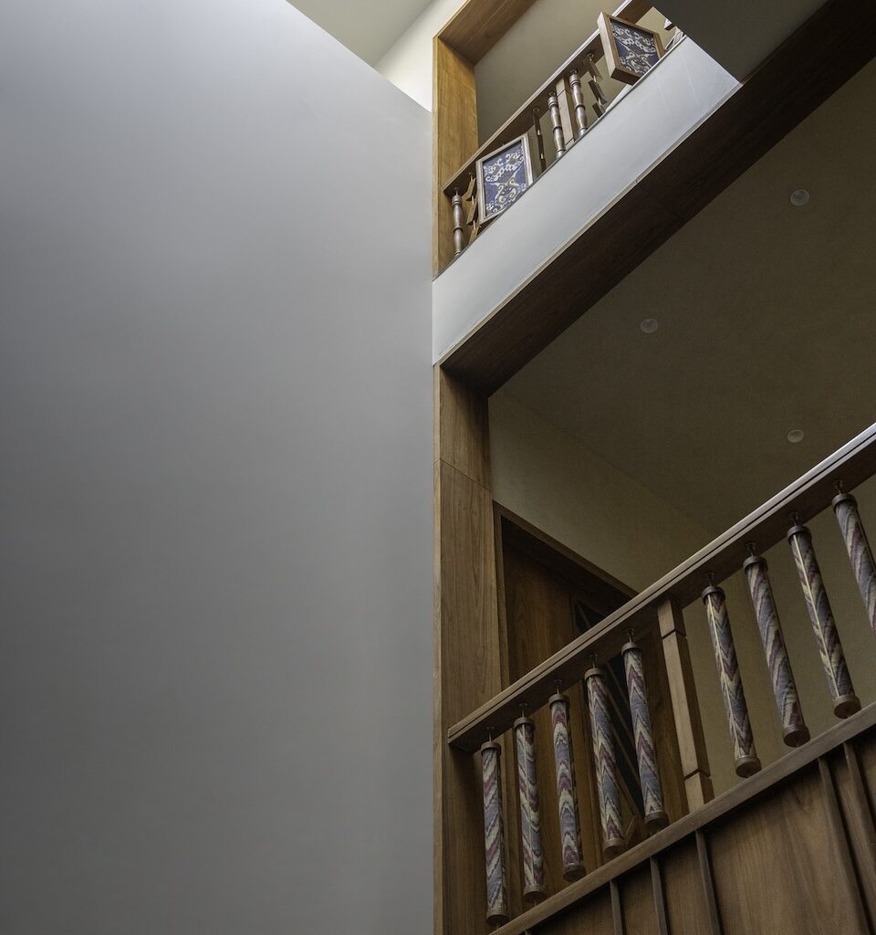 Traditional elements such as jharokhas, pivoting railings, wicker shutters, and transformable partitions are reinterpreted in a modern vocabulary. The pooja room sits beneath a skylight, while the master bedroom opens into this space, layering light and symbolism.