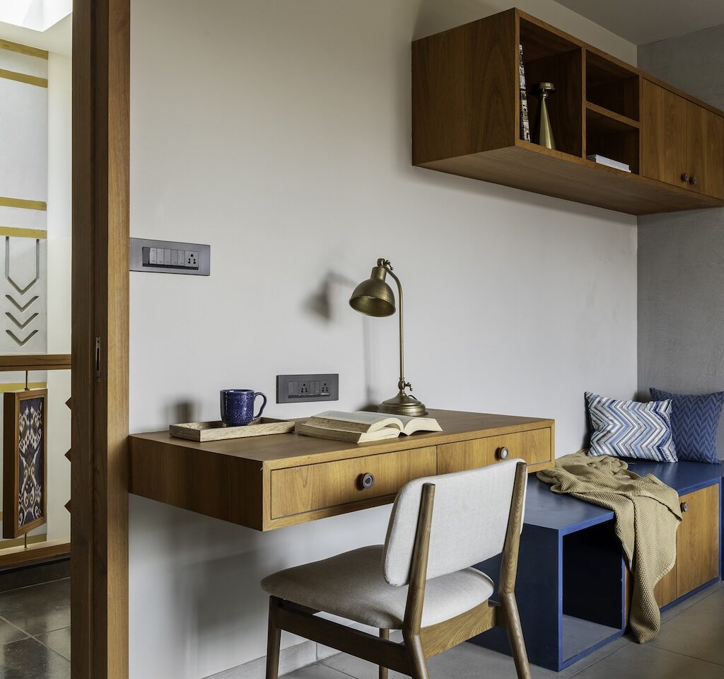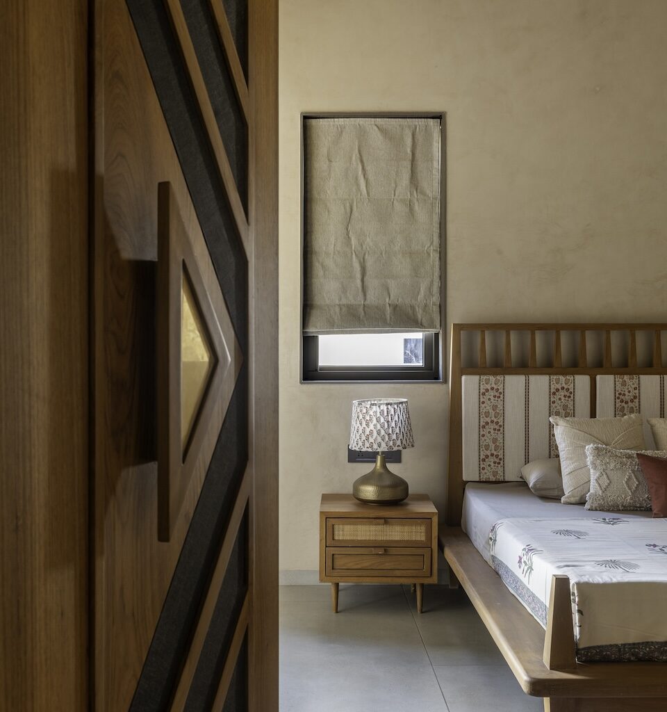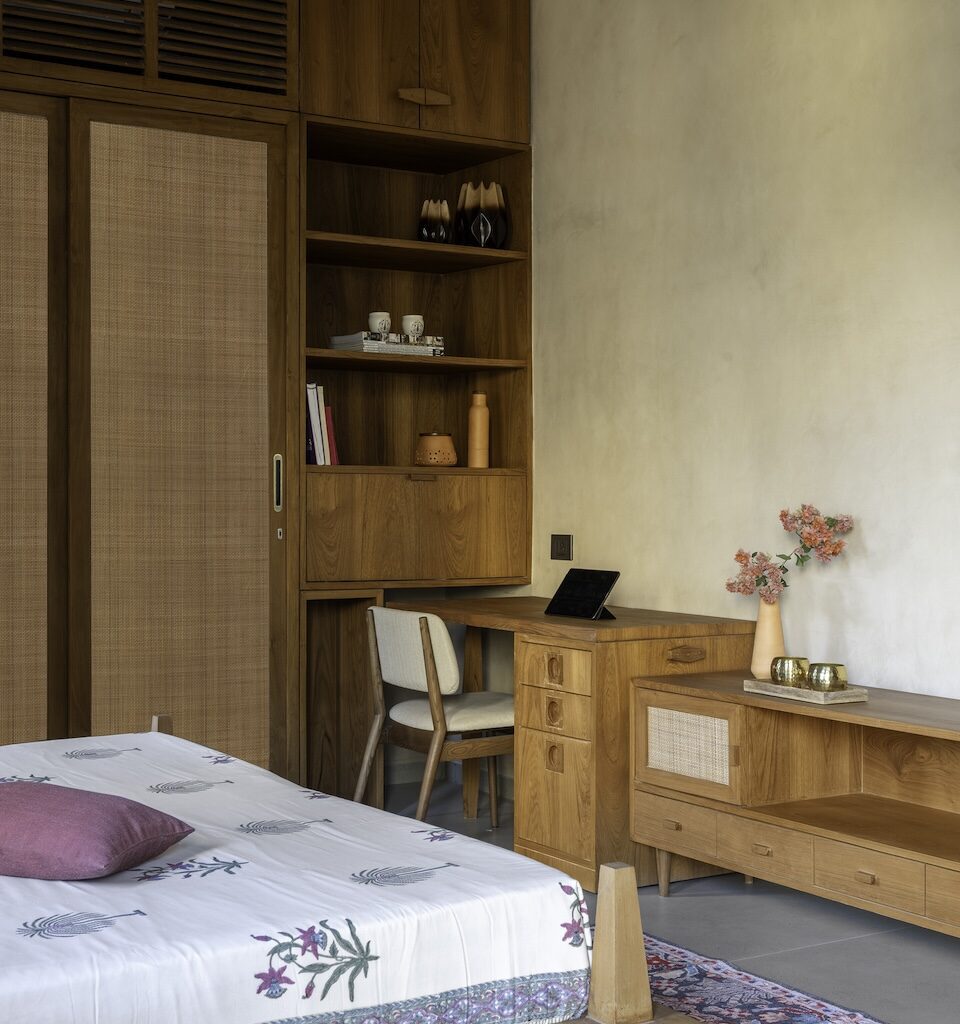 The home features solid teak wood, veneers, brass accents, Indian stones, and lime plaster. Built-in beds, cupboards, and consoles were crafted on site, supplemented by furniture from DTale Modern, Fabindia Home, and Savana Living. Soft furnishings from D’Décor and Asian Paints add warmth.