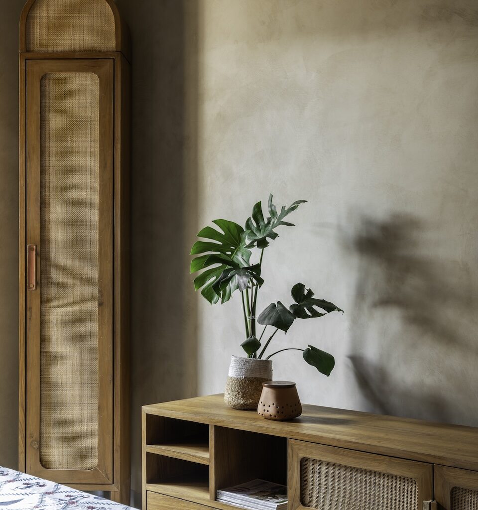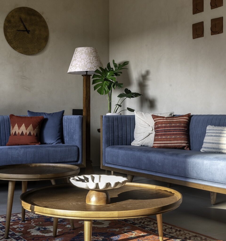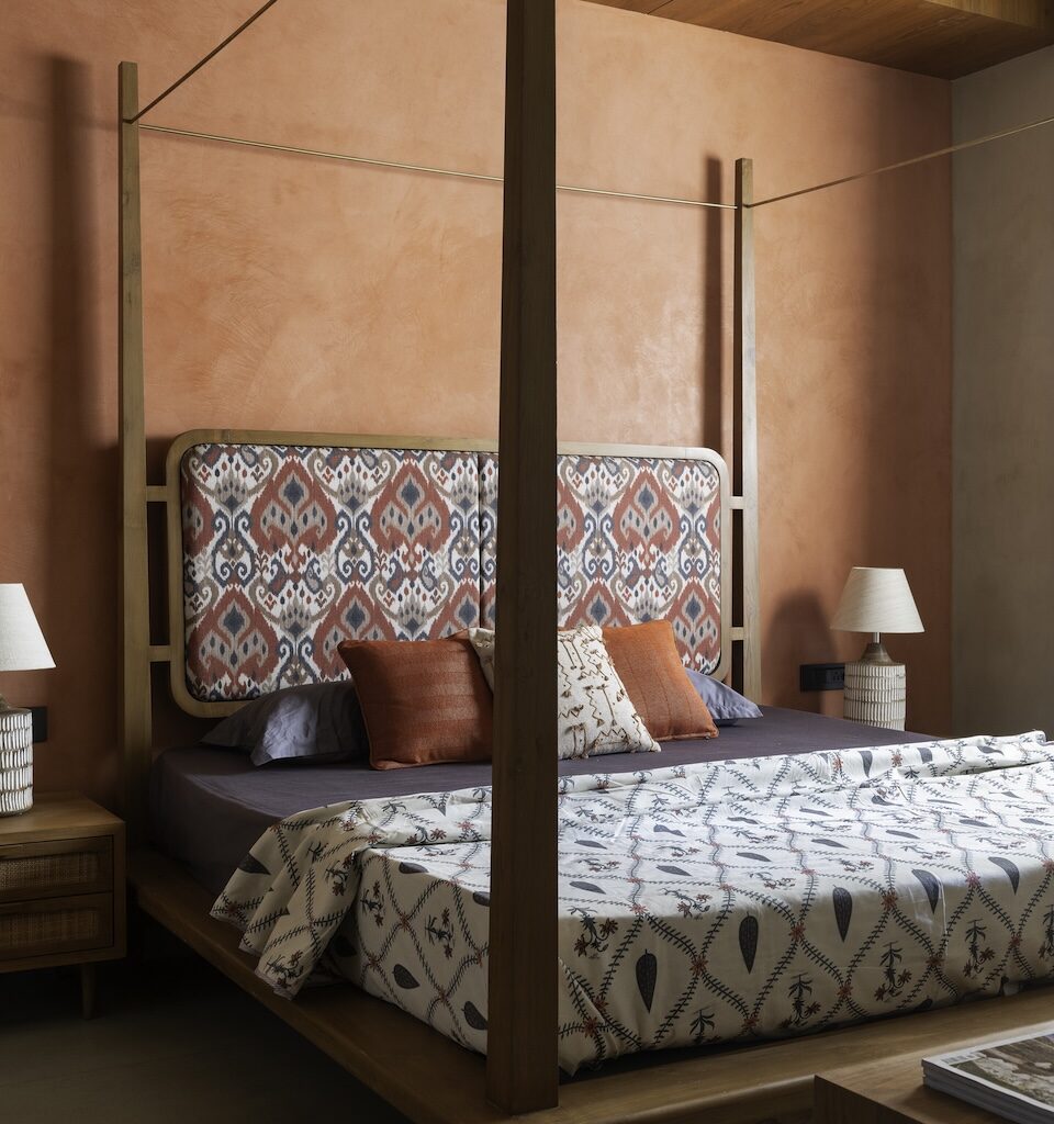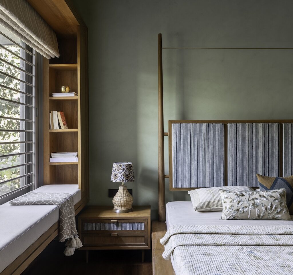 The home features solid teak wood, veneers, brass accents, Indian stones, and lime plaster. Built-in beds, cupboards, and consoles were crafted on site, supplemented by furniture from DTale Modern, Fabindia Home, and Savana Living. Soft furnishings from D’Décor and Asian Paints add warmth.