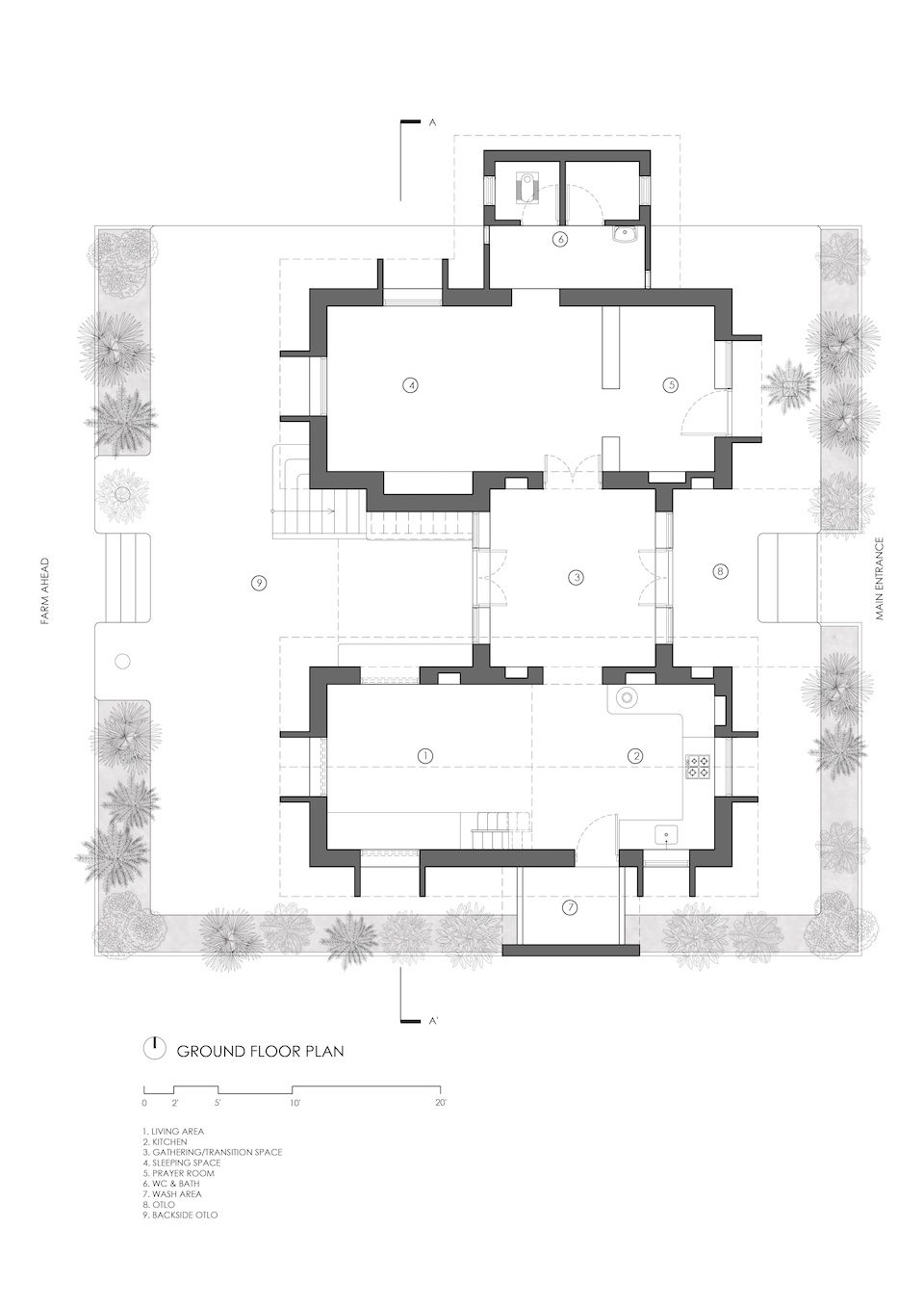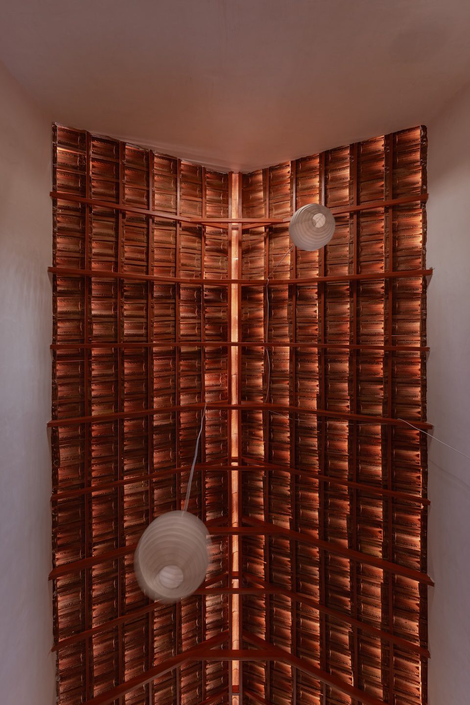 Material choices reinforce the project’s logic of continuity. House of Nostalgia draws from what the land itself offers: brick, stone, lime, bamboo, and timber sourced from the immediate context. These materials were chosen not out of sentimentality or craft nostalgia, but for their performance, economy, and environmental logic. Lime enables breathability and passive cooling; brick and stone provide density and low thermal conductivity; bamboo, used in the slab construction, is lightweight, cost-effective, and locally abundant.