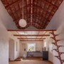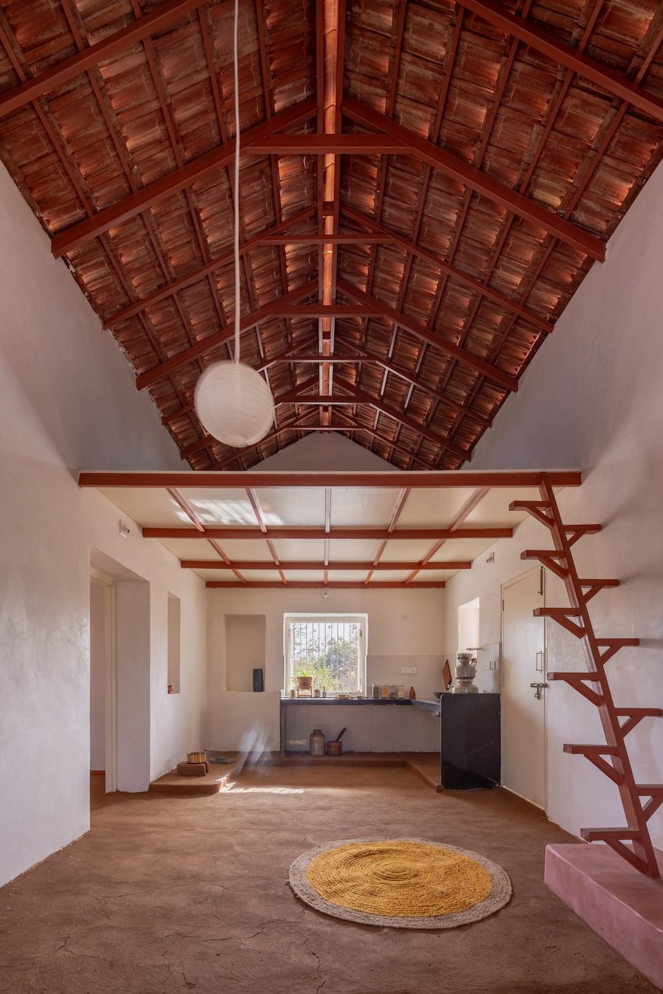 The structure is composed of three interconnected volumes: a sloped Mangalore-tiled unit with a mezzanine loft, an RCC slab module housing the bedroom and pooja room, and a bamboo-reinforced slab unit accommodating the kitchen and services. The architectural language draws from generations of rural logic, expressed through thick walls, built-in niches, transitional thresholds, verandahs, and a central courtyard. These elements regulate heat, organise space, support social interactions, and extend domestic life into the outdoors.