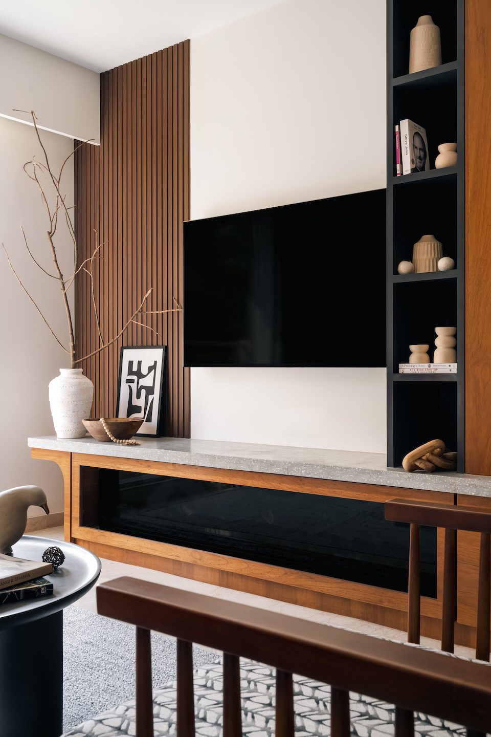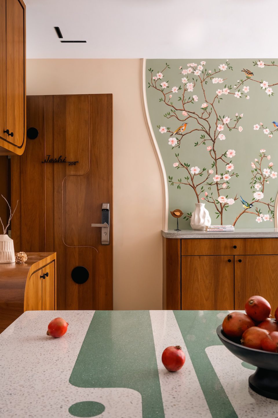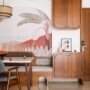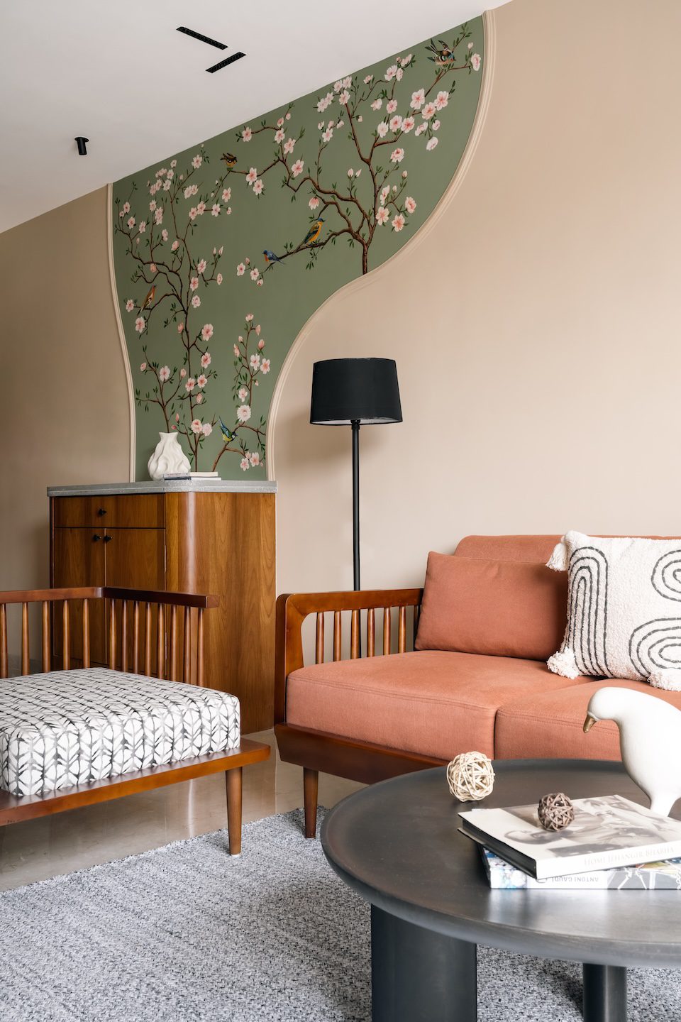 The entryway sets the tone with a hand-painted tropical mural in sage green, alive with delicate songbirds. It evokes the charm of a countryside orchard and introduces the home’s serene narrative. In the living room, a plush three-seater sofa in soft beige anchors the space, and is complemented by a mid-century-style relaxation chair and a sleek terrazzo-top coffee table. Fluted wooden panelling adds warmth to the vertical surfaces, while open shelving displays ceramics, travel finds, and art that reflect the family’s story. In the entertainment area, a curved-edge console with an integrated fireplace takes centre stage, continuing the design language of soft edges and organic forms that flow throughout the home.