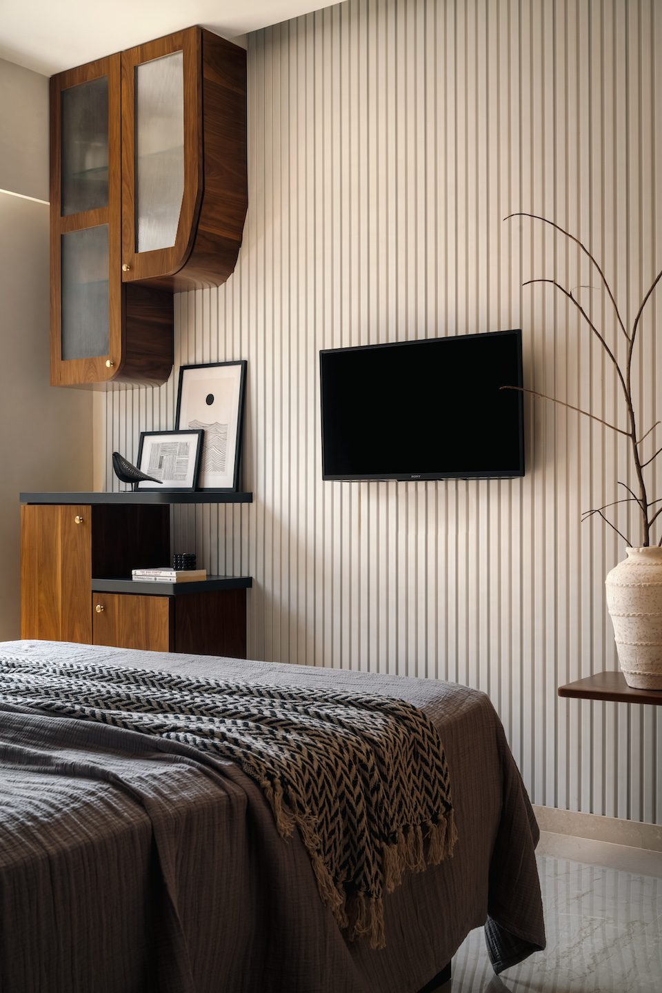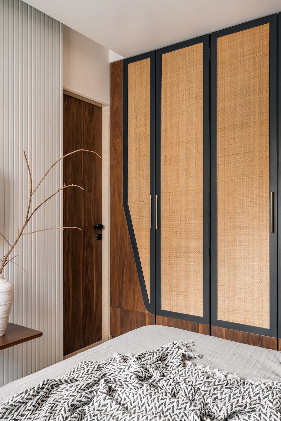 The master bedroom embodies understated luxury. A custom-designed wardrobe stands out with its blend of natural rattan, deep charcoal framing, and veneer. The bed sits against a vertically slatted veneer headboard that extends into an integrated study corner, creating a cohesive backdrop. Earthy tones, textured linens, and brass bedside lights complete the composition, bringing a sense of warmth and balance to the space.