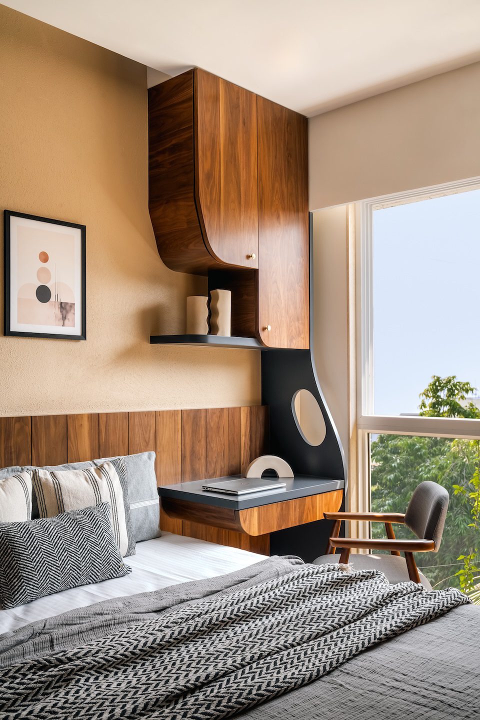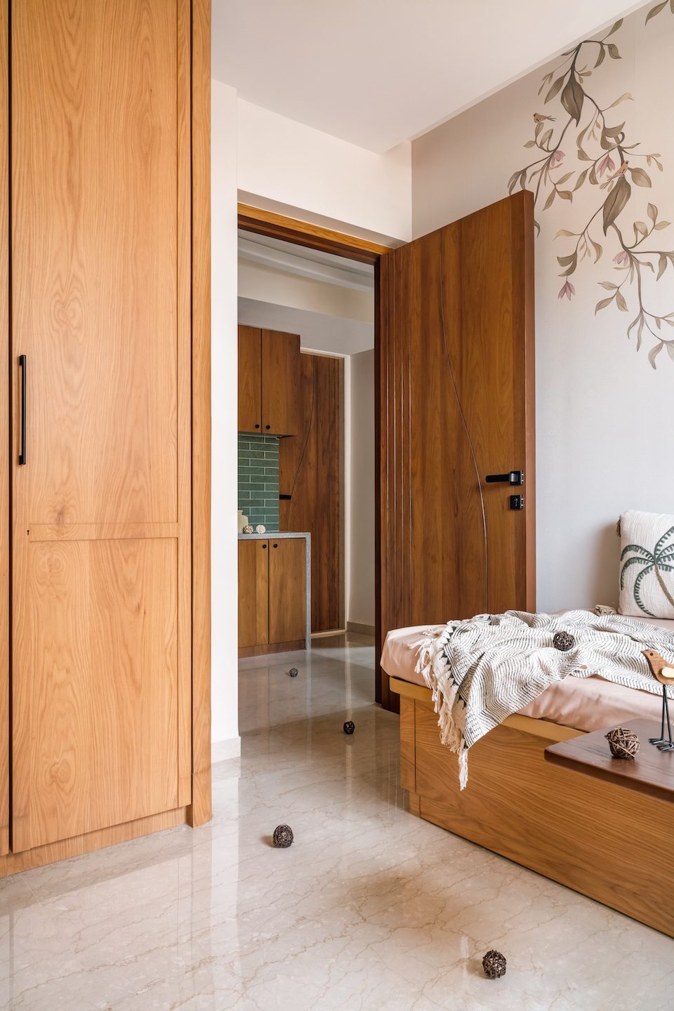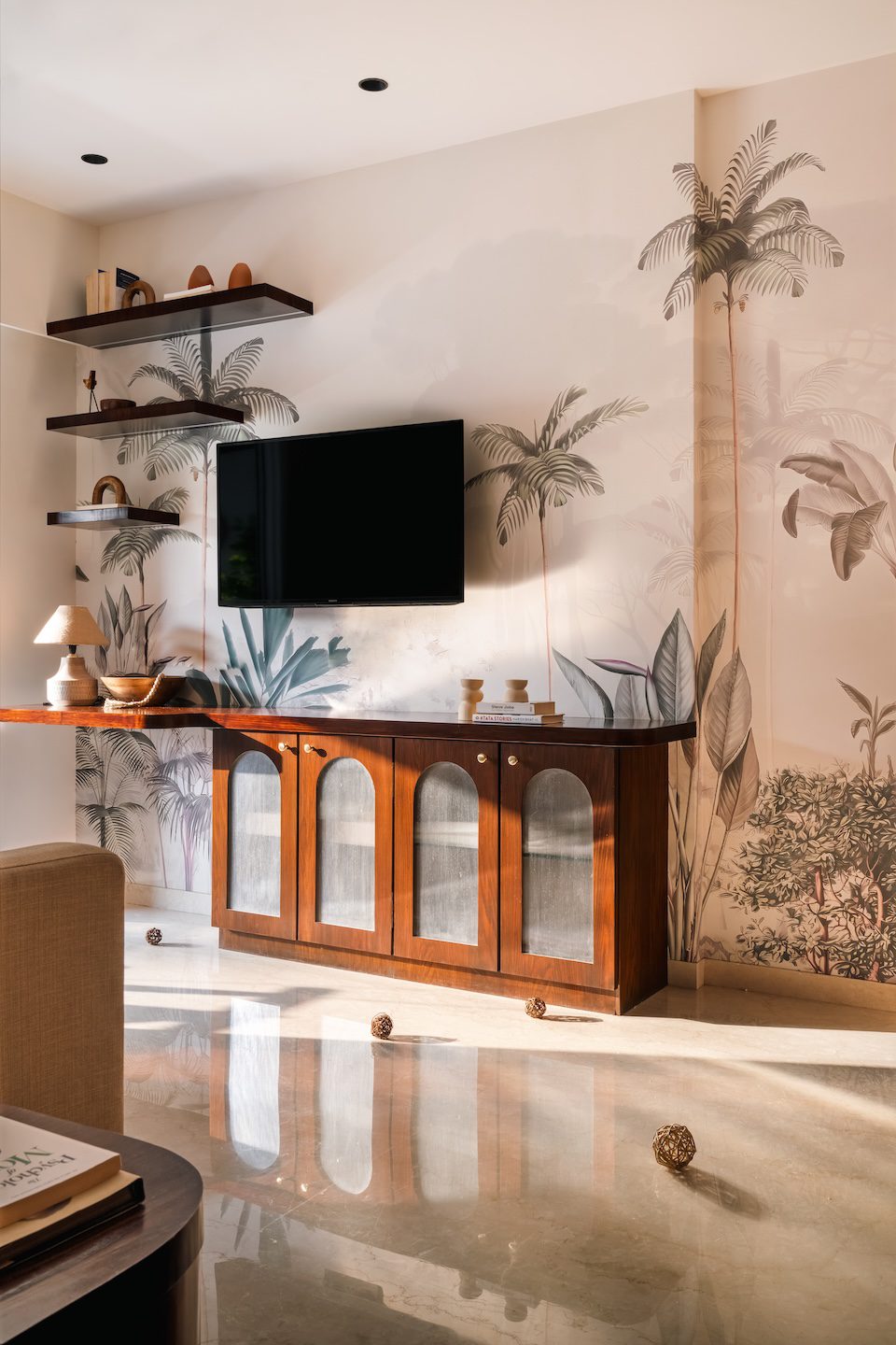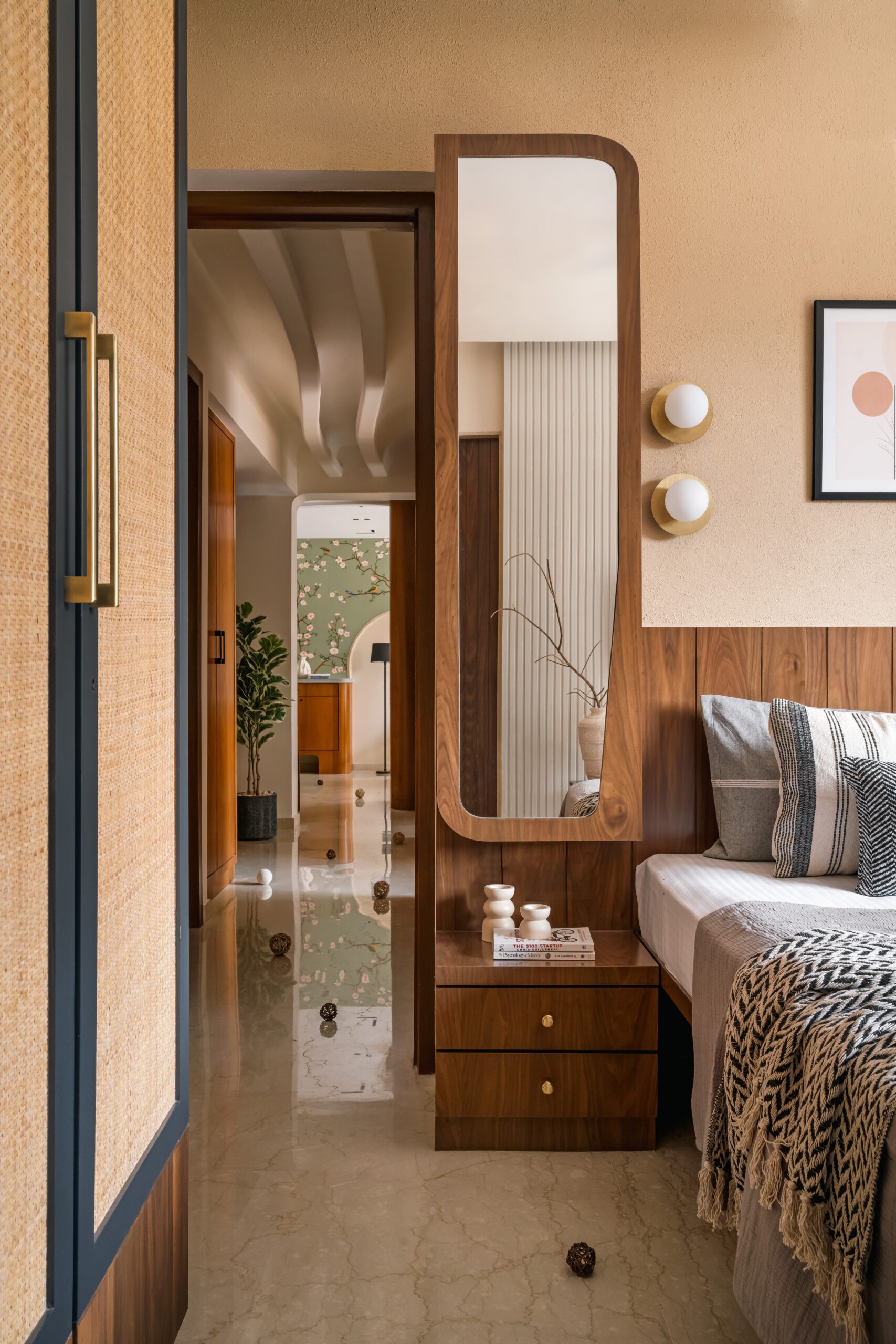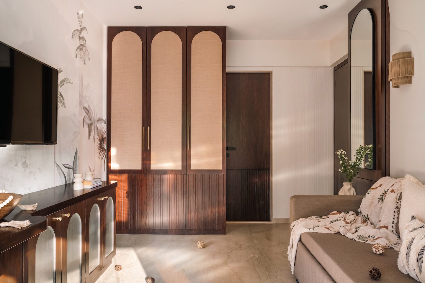 The mother’s bedroom leans into warmth and nostalgia while maintaining contemporary grace. The palette is grounded in neutral tones, accented with deep wood and earthy textures. The wardrobe stands out with its arched panels wrapped in woven jute fabric, fluted wooden framing, and integrated handles. A full-length arched mirror amplifies natural light, while soft tropical wallpaper behind the floating shelves adds depth and visual texture. The curved panelling along the wall behind the sofa-cum-bed becomes an elegant architectural gesture that brings softness and refinement to the otherwise muted space.