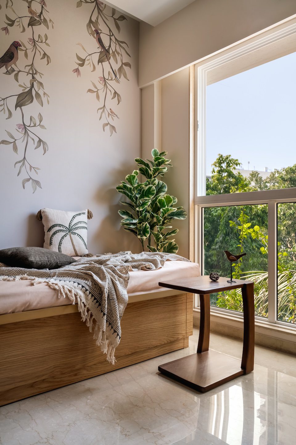 Flooded with natural light, the study is conceived as a calm cocoon of modern minimalism. A streamlined wooden desk free of visual clutter is paired with floating open shelves that keep the space light and purposeful. A soft botanical wallpaper behind the daybed introduces nature’s stillness, while muted furnishings and sheer drapes lend the room an air of ease and focus.