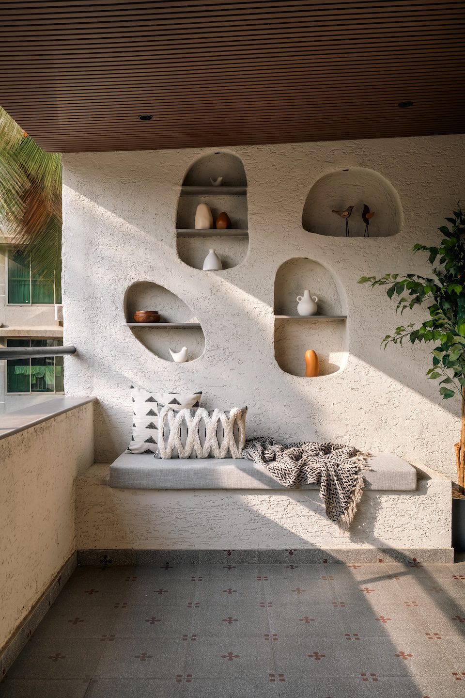 The home features two balconies, each distinct in mood and design. The smaller balcony, adjoining the living room, feels intimate and restful…ideal for a quiet read or morning chai. The larger balcony, accessible through the mother’s bedroom, is envisioned as a Mediterranean-inspired retreat. Sculpted wall niches punctuate textured plaster surfaces, displaying curated pottery and planters. The space has two seating options—a built-in seating nook that runs along one wall which is layered with neutral-toned cushions; and a playful handcrafted wooden swing.