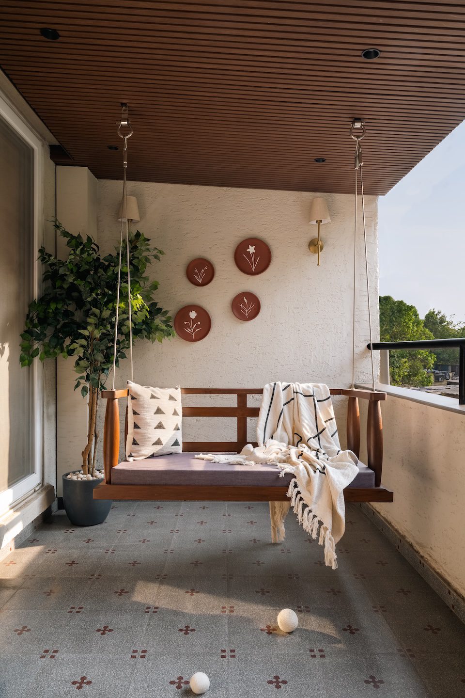 Another notable transformation took place in the balcony. Originally open to the sky, it was reimagined with a ceiling added under the builder’s approved guidelines. This structural enhancement enabled a cohesive, design-forward outdoor zone—one that blends Mediterranean elements with sculpted niches, built-in seating, and a handcrafted swing, turning it into a poetic extension of the indoors. Though minimal, these interventions were deliberate and effective, enhancing openness, softening boundaries, and reinforcing the home’s tranquil sense of retreat.