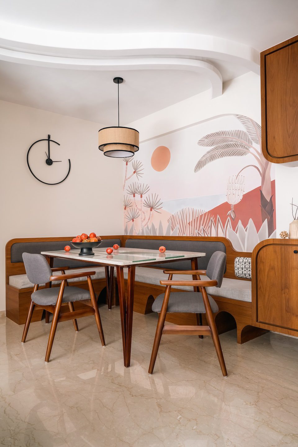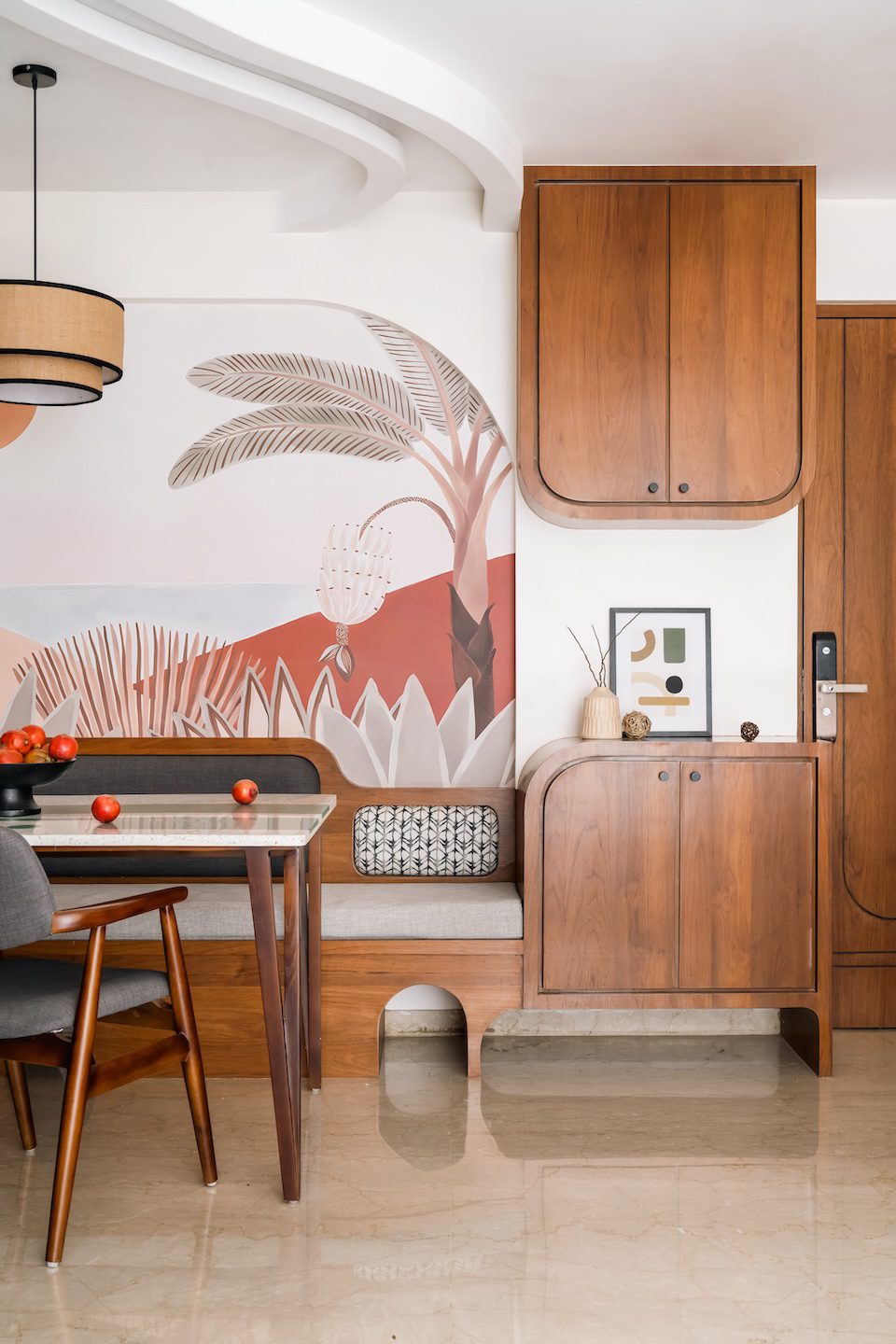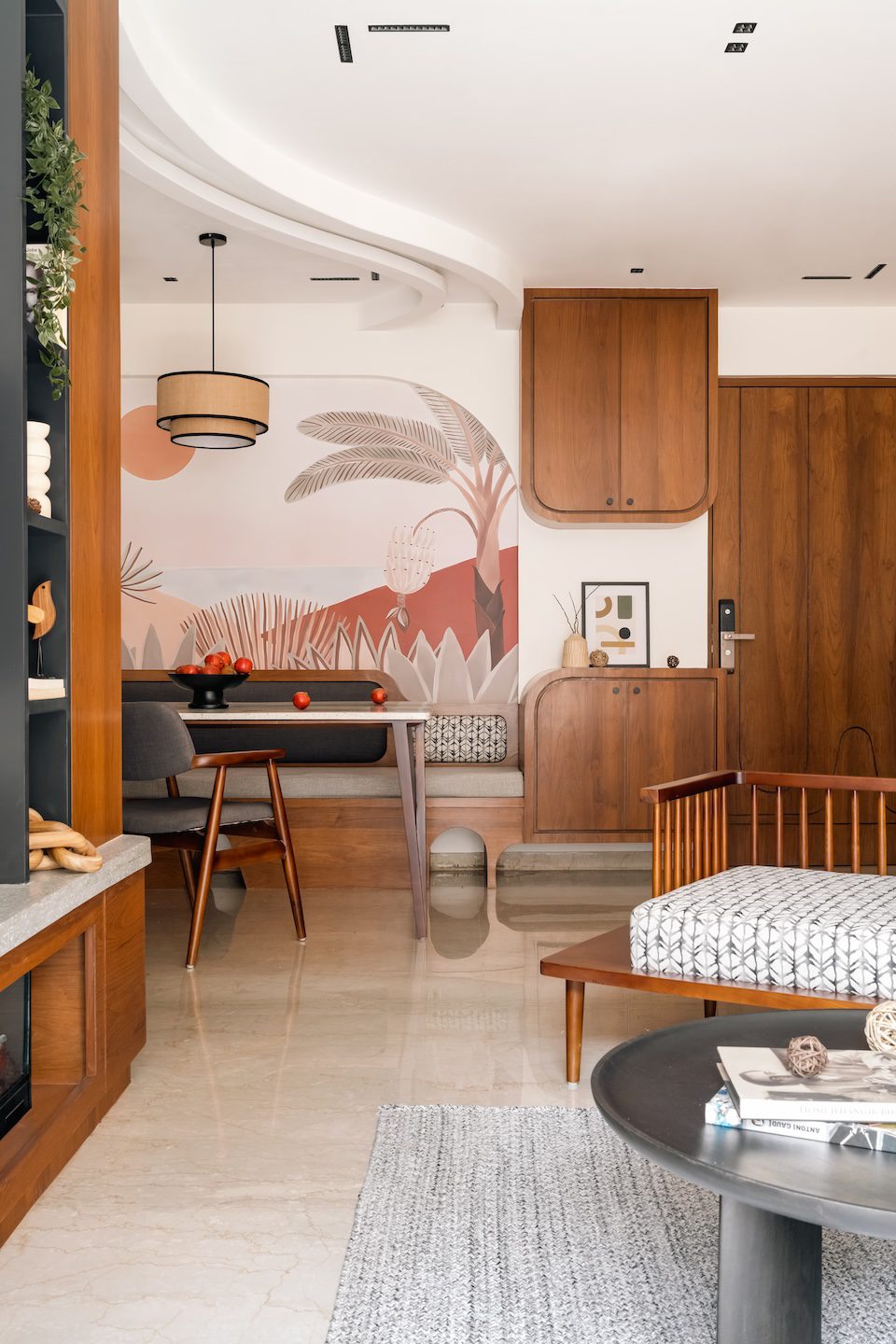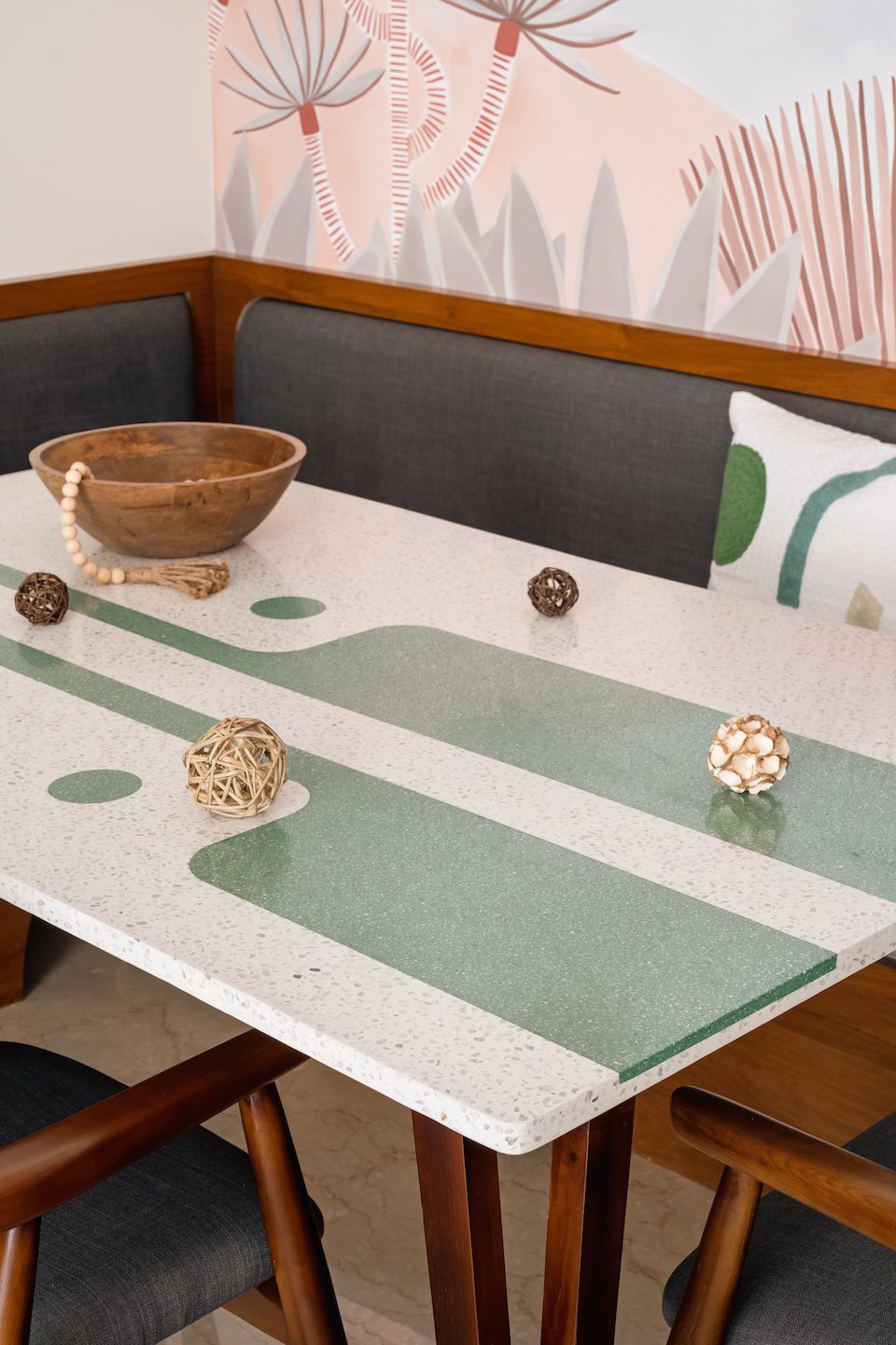In the dining area, the material palette finds its most expressive moment with a custom terrazzo table featuring bold green inlay forming a sculptural centrepiece. Around it, charcoal grey upholstered chairs with solid wood frames and a curved bench create a sense of intimacy and ease. Curves reappear in the cabinetry, furniture, and ceiling detail, replacing rigidity with gentle movement. Behind the dining space, a stylised desert artwork in shades of peach, rust, and sandy beige deepens the warmth, mirroring the palette of the furnishings and finishes around it.