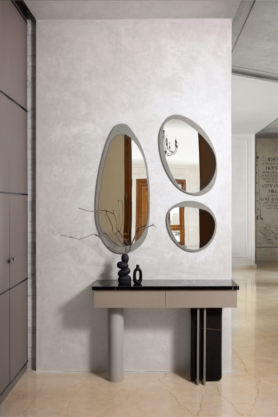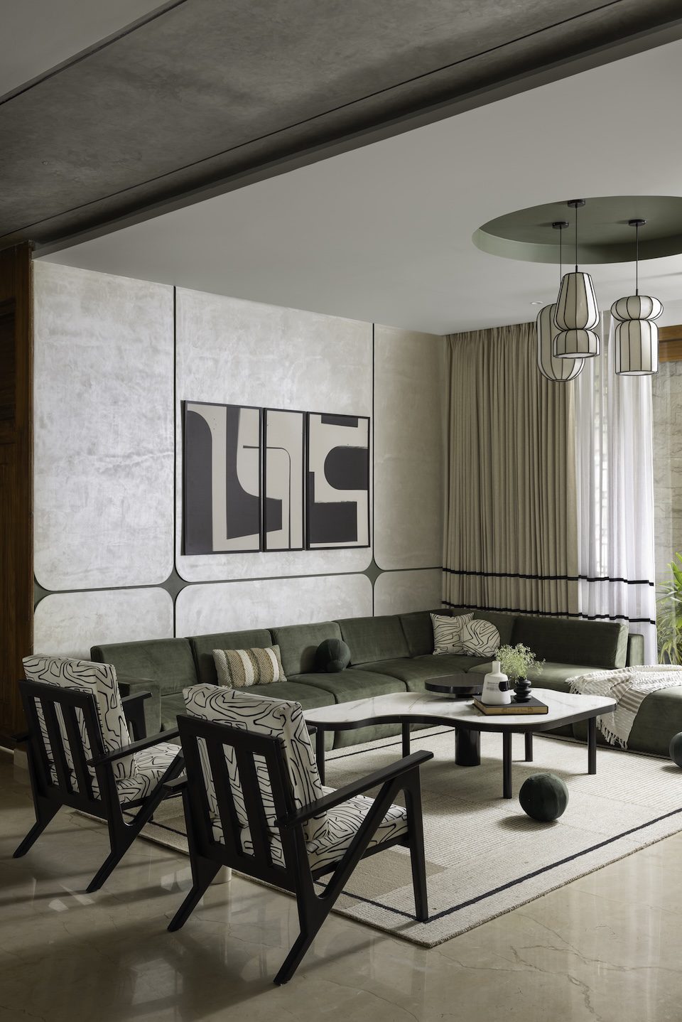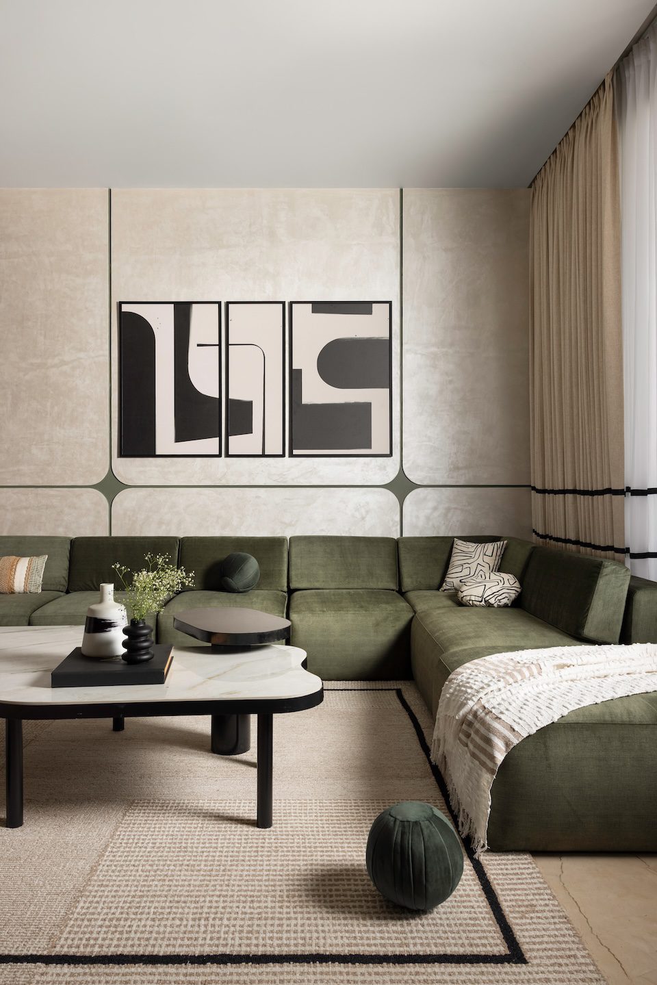 The foyer sets the tone with texture-painted walls, a floating bench-inspired seat, a console with drawers, and an organically shaped mirror—all rendered in a neutral palette. In the living area, an olive-green sectional sofa and a black-and-white accent chair anchor the space, while a curved wall conceals an awkward column and softens the geometry. Layered lighting and black trims add definition and depth.