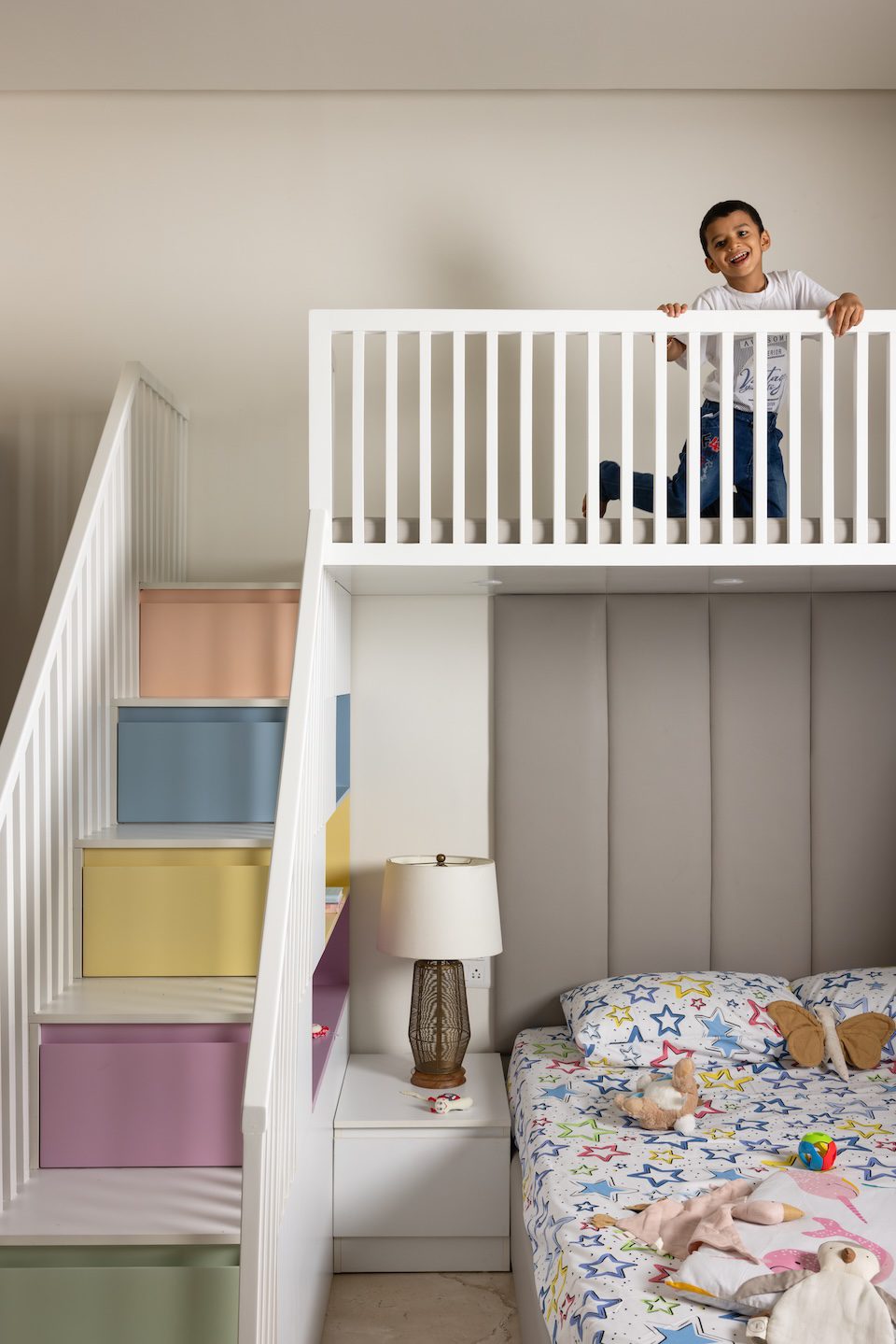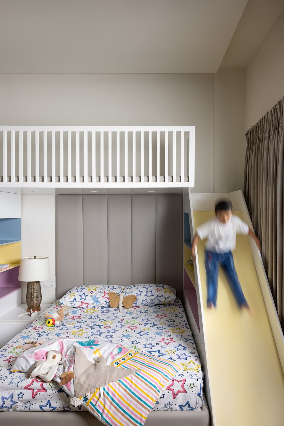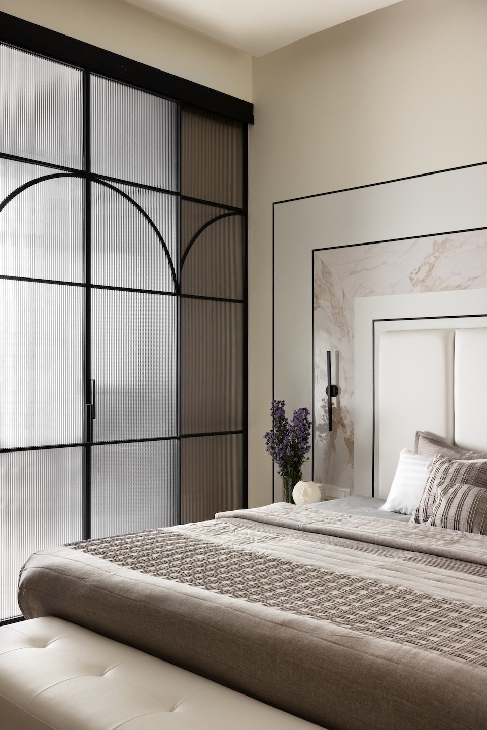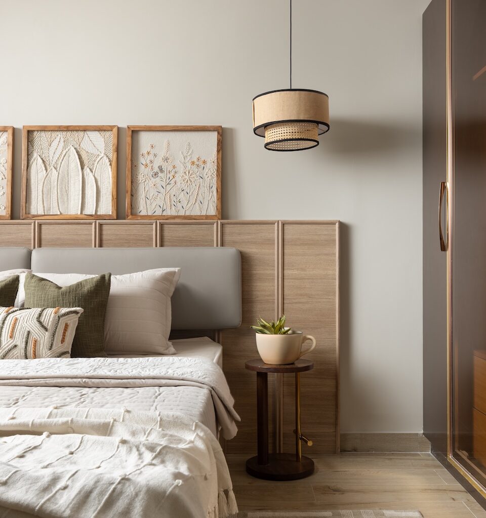 The dining area continues this flow with a warm panelled wall and a sleek console that visually connects to the kitchen. Here, a redefined island, matte finishes, subway tiles, and fluted glass create a balanced composition of texture and tone. In the master bedroom, the original bed was retained and reimagined with a new headboard, while its adjoining balcony now functions as a walk-in wardrobe. The children’s room follows a gender-neutral, adaptable design, allowing it to evolve with time. Of the three balconies, one serves as the wardrobe extension, another as an alfresco pantry, and the third as a scenic retreat complete with a water fountain that forms a tranquil punctuation to this thoughtfully modern home.