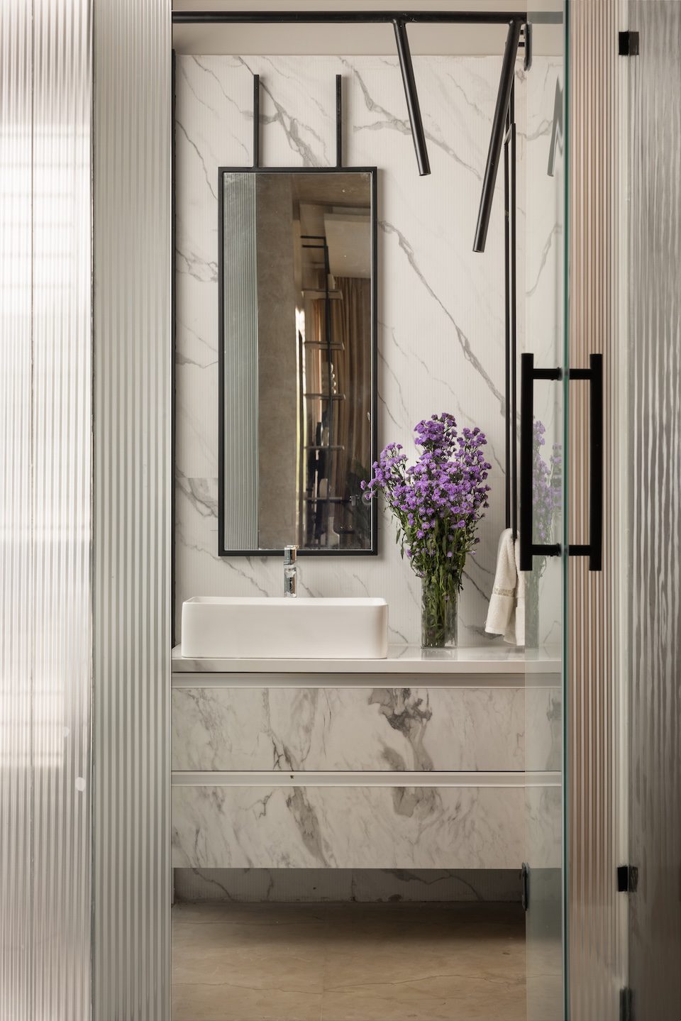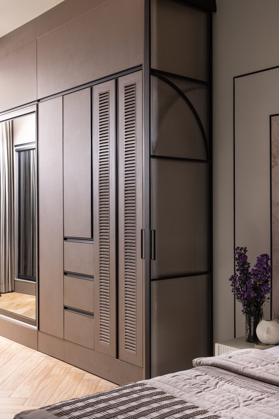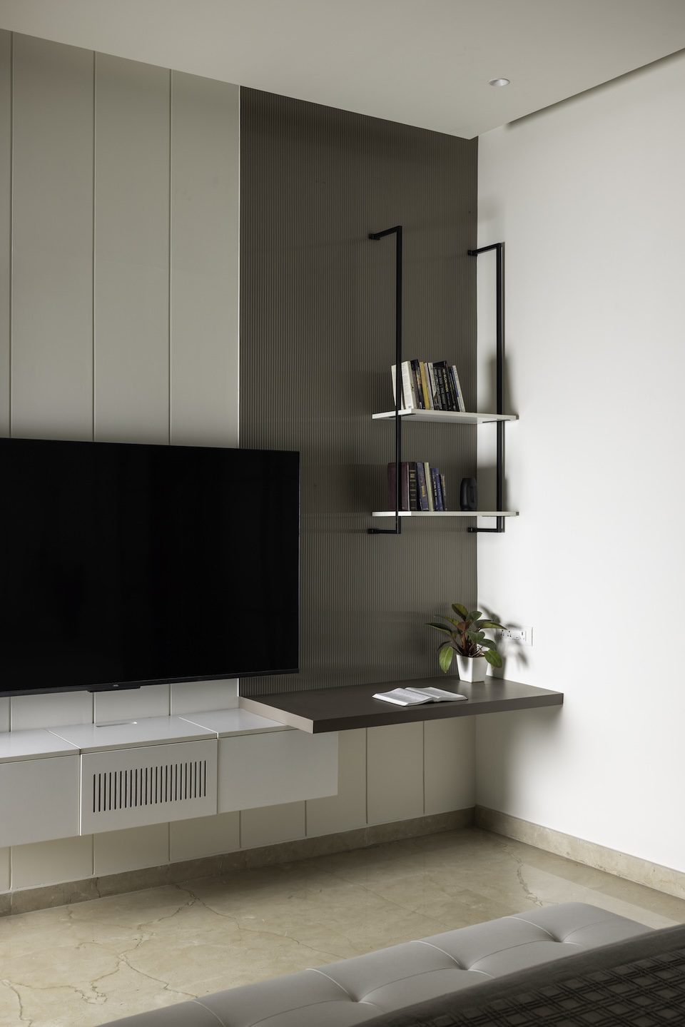 “Converting the balconies into livable spaces required extensive slab work and waterproofing with limited site access,” shares Manoj. “Repurposing ornate elements while adhering to minimal design within budget constraints was also challenging. Curved walls, fluted partitions, and concealed storage required precision and planning to fit within the rigid framework,” he adds with quiet pride.