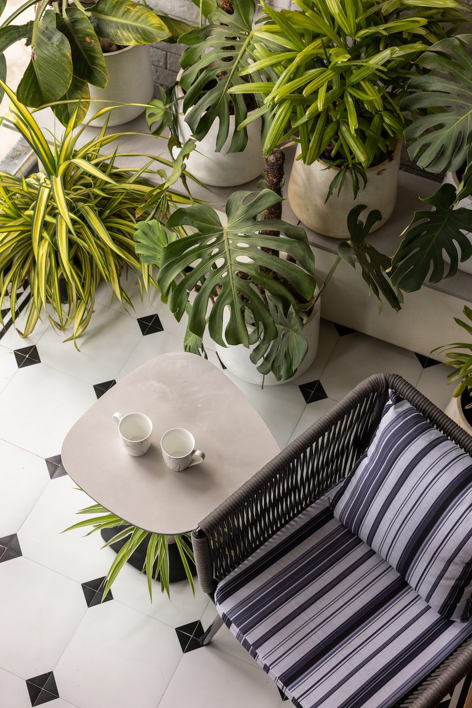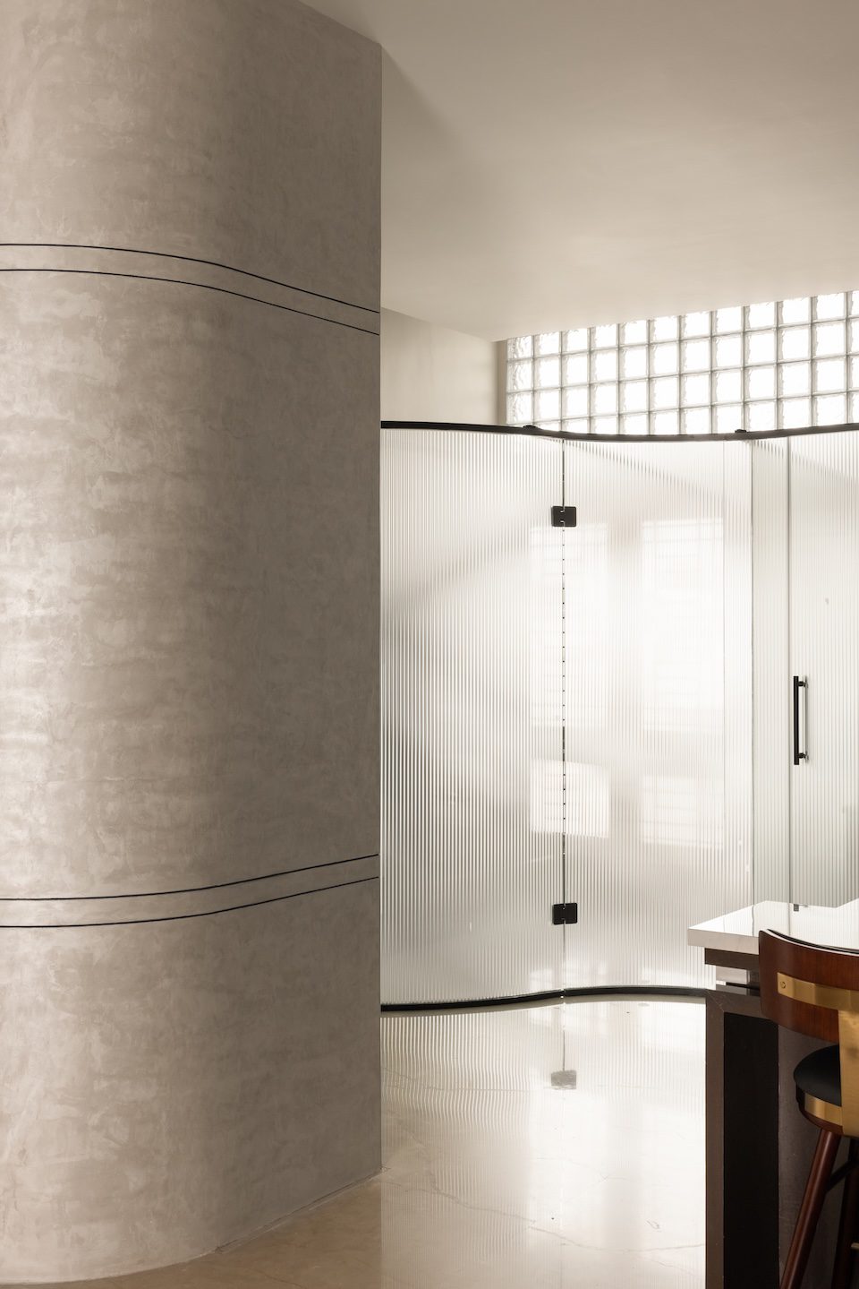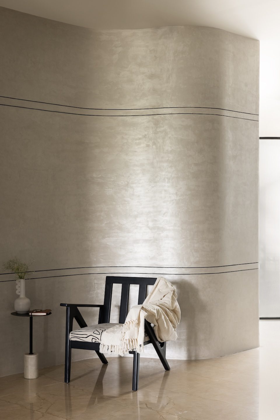 The balconies underwent complete transformation: one became a seamless walk-in wardrobe, another evolved into an alfresco pantry, and a third turned into a serene retreat with a live edge and a cascading water fountain. A curved partition resolved the challenge of an awkward column, while a curved glass divider now discreetly conceals the laundry area.