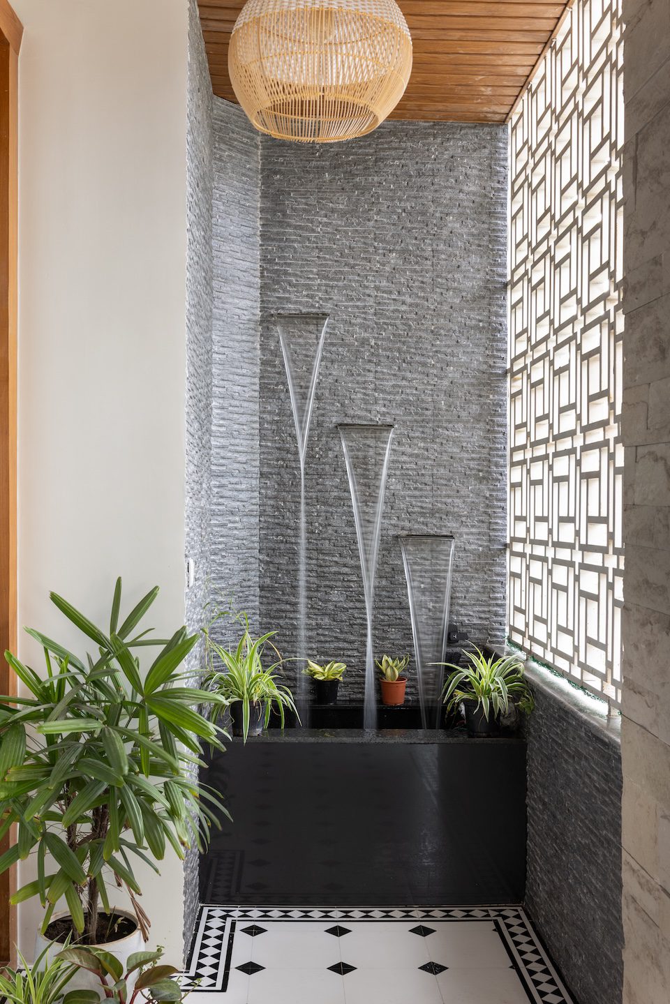 “The client wanted a functional yet luxurious home with minimal intervention and a budget-conscious execution. Key requirements included a walk-in wardrobe in the master suite, an operational kitchen alongside the existing island, and the addition of a water feature. The client also insisted on reusing most of the existing furniture and civil elements,” shares Kiran.