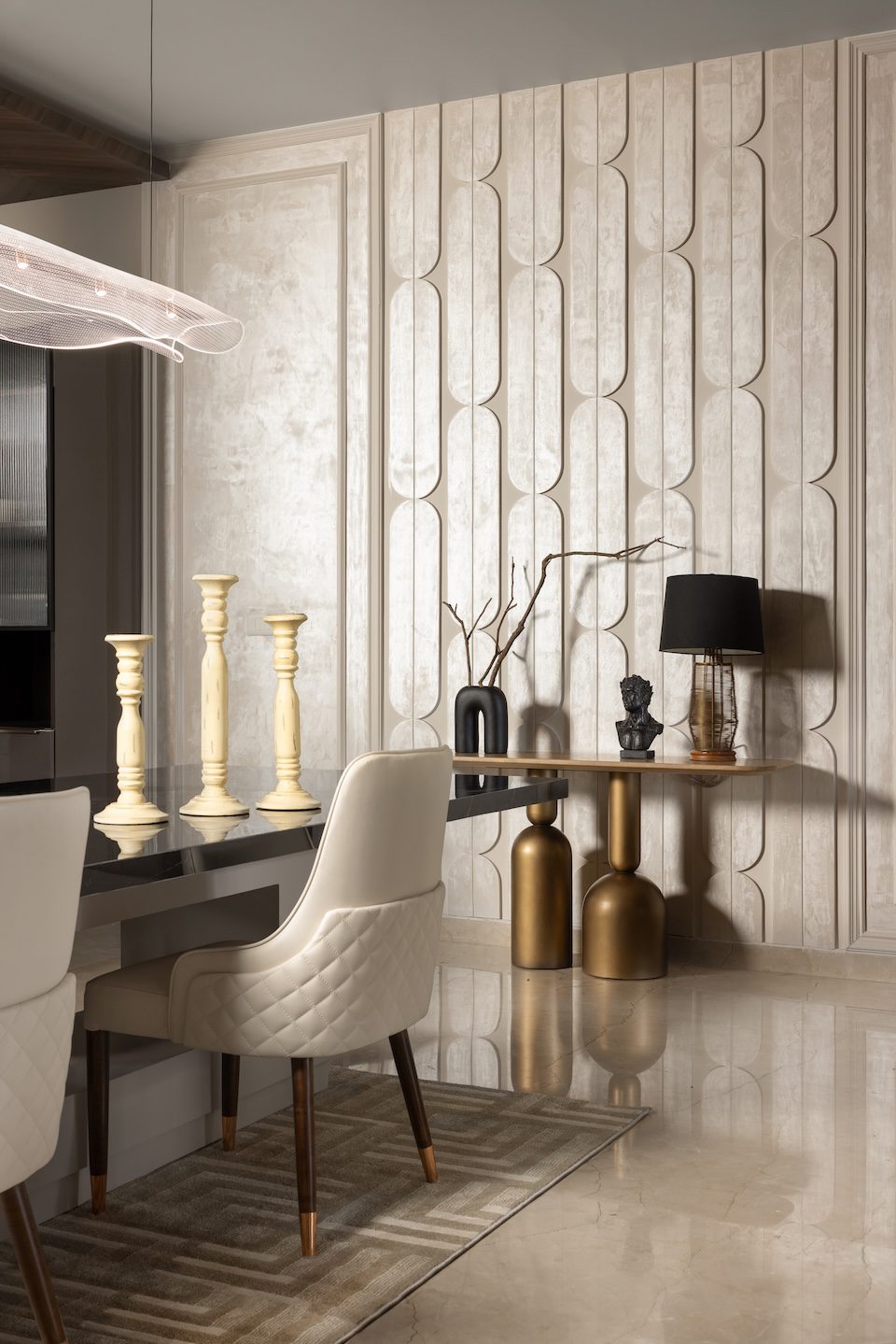 The design sought calm through subtraction by removing excess, highlighting functions, and introducing a warm, restrained elegance that felt rich yet grounded. Every detail was chosen for its quiet visual strength and practical purpose, allowing the space to breathe. Existing elements were thoughtfully repurposed with a contemporary sensibility: beds were reupholstered, finishes refreshed, and headboards customised to create a cohesive language. The kitchen island was redesigned in muted materials, reinforcing visual continuity, while the bold black trims of the value wall framed the home’s renewed identity.