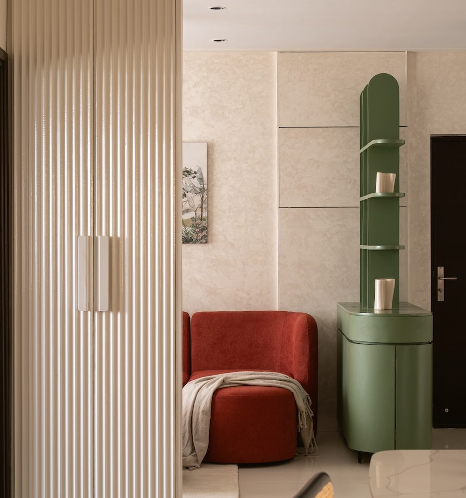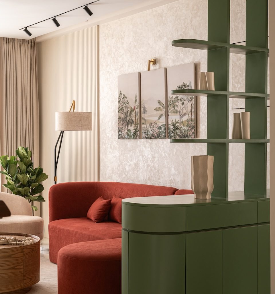 Entry begins at a foyer defined by a custom curved unit that provides storage while creating a graceful visual barrier between the entrance and living area. Its bold green finish and soft edges introduce the home’s personality—elegant yet welcoming.