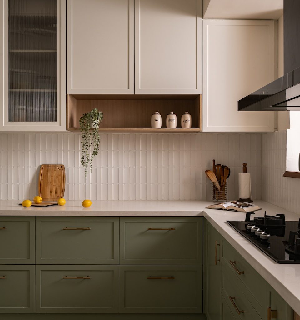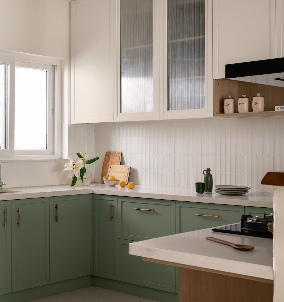 The open kitchen continues the home’s calm energy: sage green cabinetry, a solid teak counter on the breakfast island, a white quartz worktop, and black appliances form a crisp, harmonious palette.